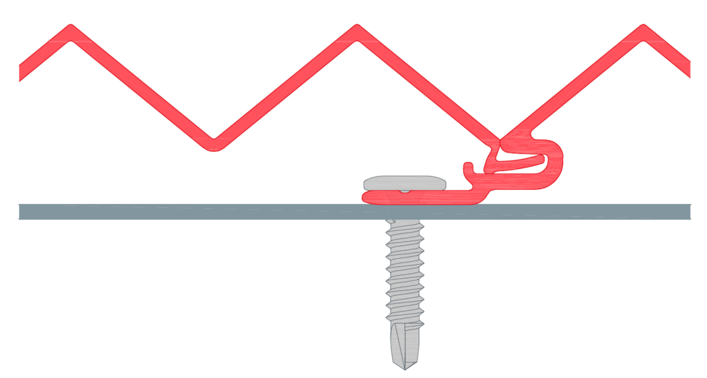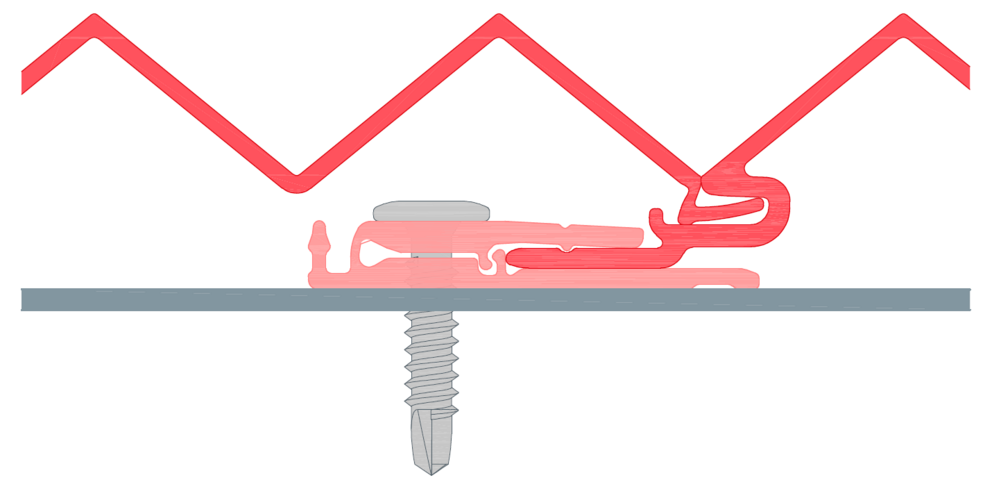 Skrytě kotvený montážní systém pero–drážka pro profily Profilwelle a Zackenprofil se skládá z příponky a speciálního vrutu (upevňovací prostředek) pro dřevěnou, ocelovou a hliníkovou spodní konstrukci.