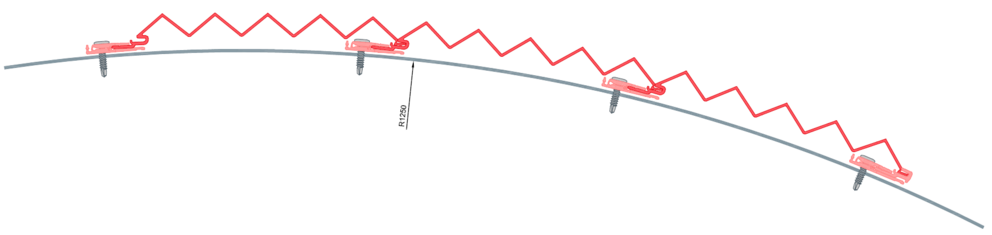 Lisované profily PREFA lze montovat také při vertikálním kladení profilů na zaobleném podkladu. Přitom je nutné dodržet pro stavební šířku 200 mm minimální poloměr r ≥ 1 250 mm.