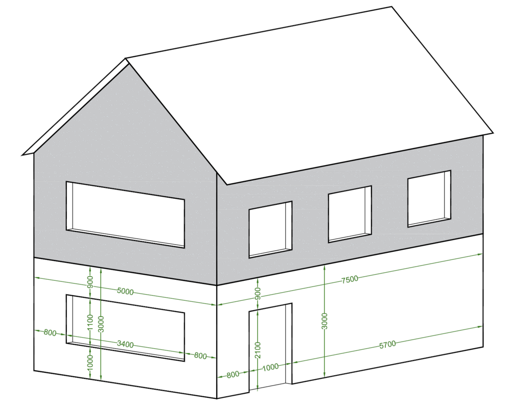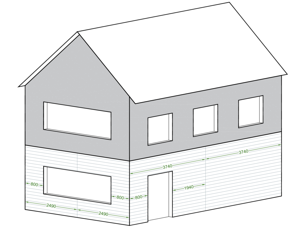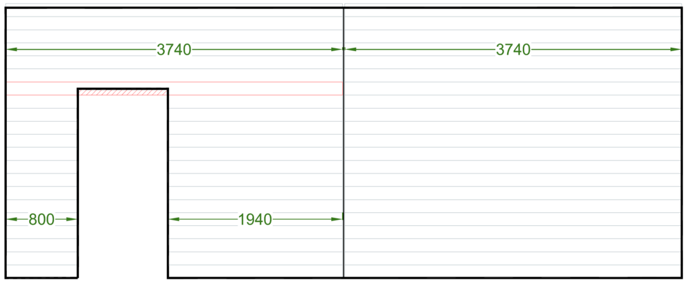 Výřezy, jako např. okna a dveře, které částečně zasahují do profilu, se při určování materiálu zanedbávají a upravují se přímo na stavbě (červeně označená plocha).