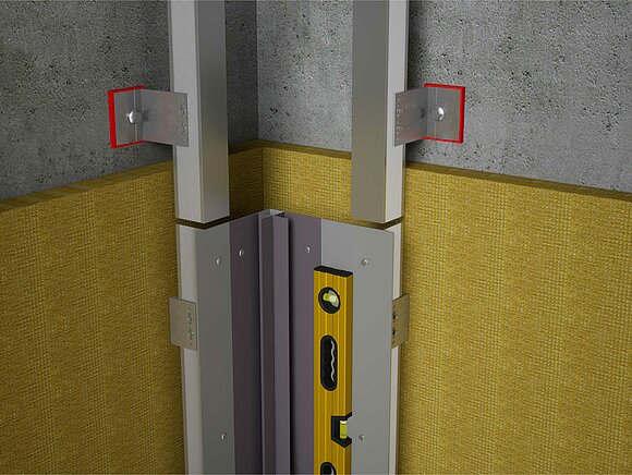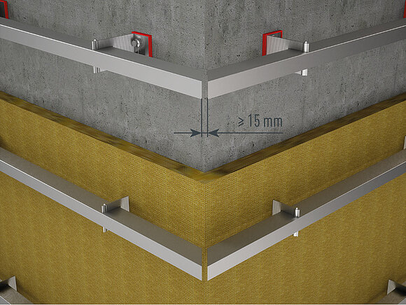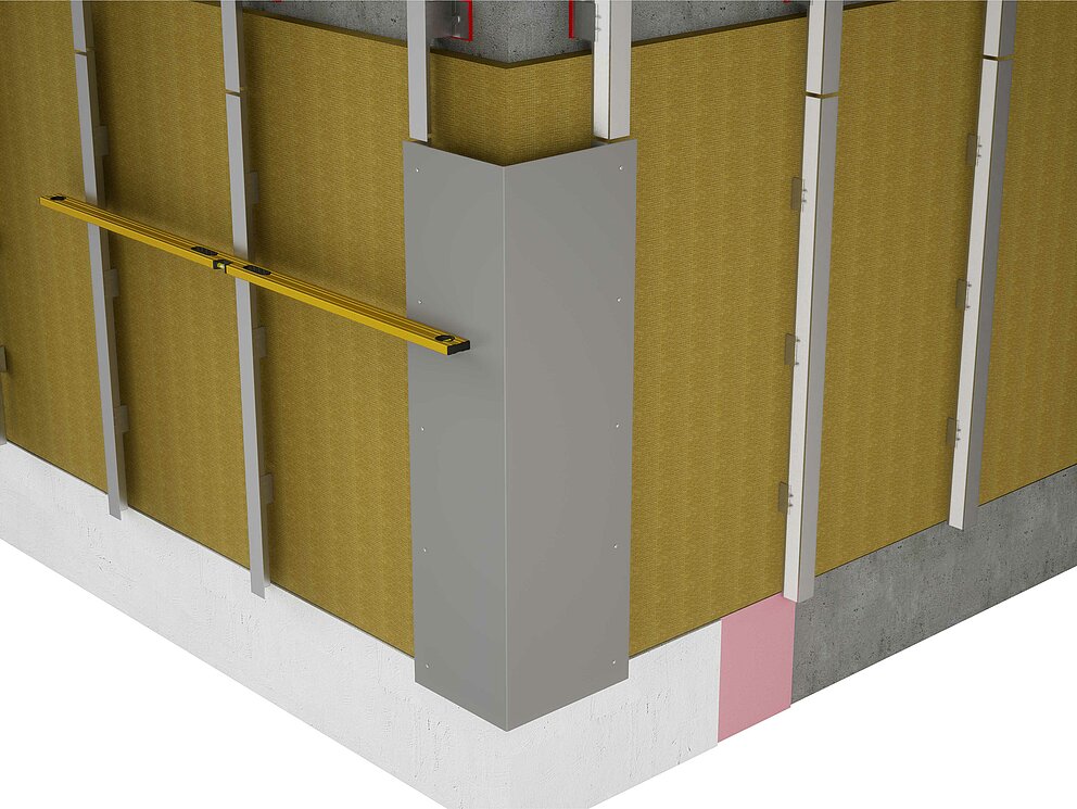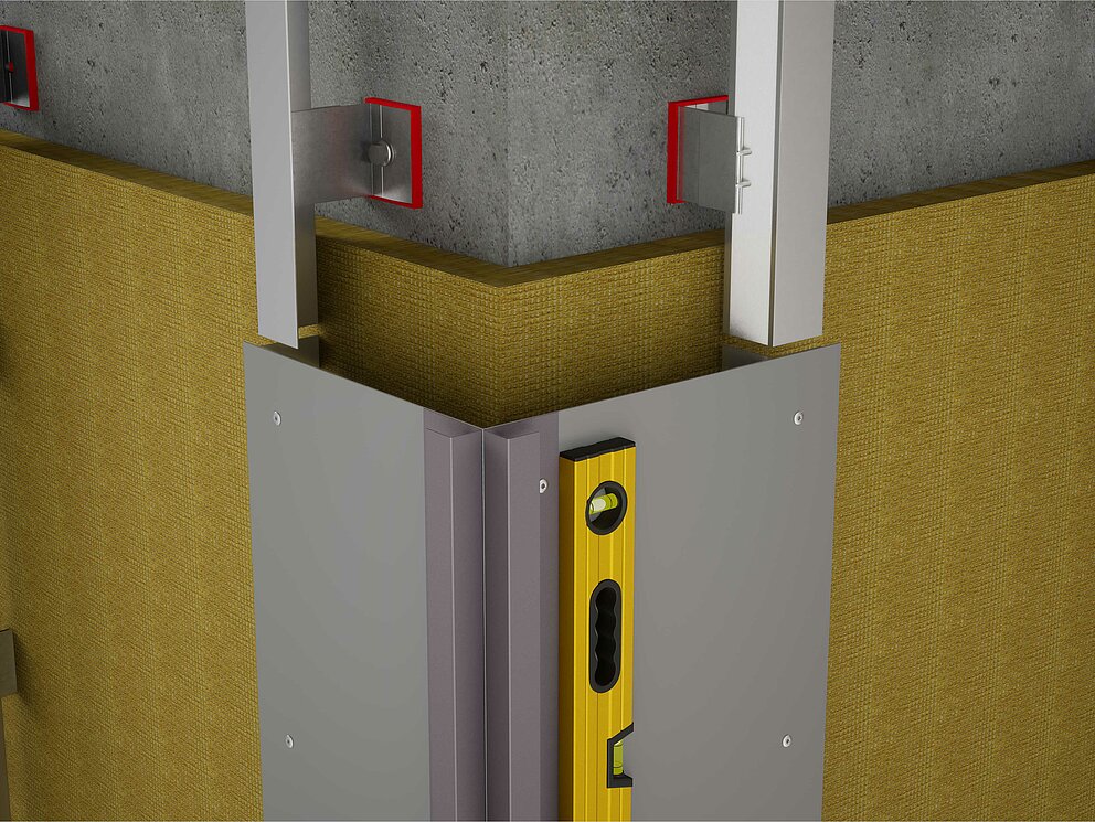 Pro montáž vnitřního nebo vnějšího rohu připravte spodní konstrukci pro horizontální pokládku profilů. Pro montáž profilů vnitřního nebo vnějšího rohu musíte nejprve spojit vertikální spodní konstrukci s nosným úhelníkem z 2 mm silného hliníkového tabulového plechu nebo pozinkovaného ocelového plechu (1 mm). Již při montáži spodní konstrukce dbejte na to, aby byly nosné profily posunuty více dovnitř o tloušťku materiálu nosného úhelníku, aby byla zajištěna rovinnost spodní konstrukce.