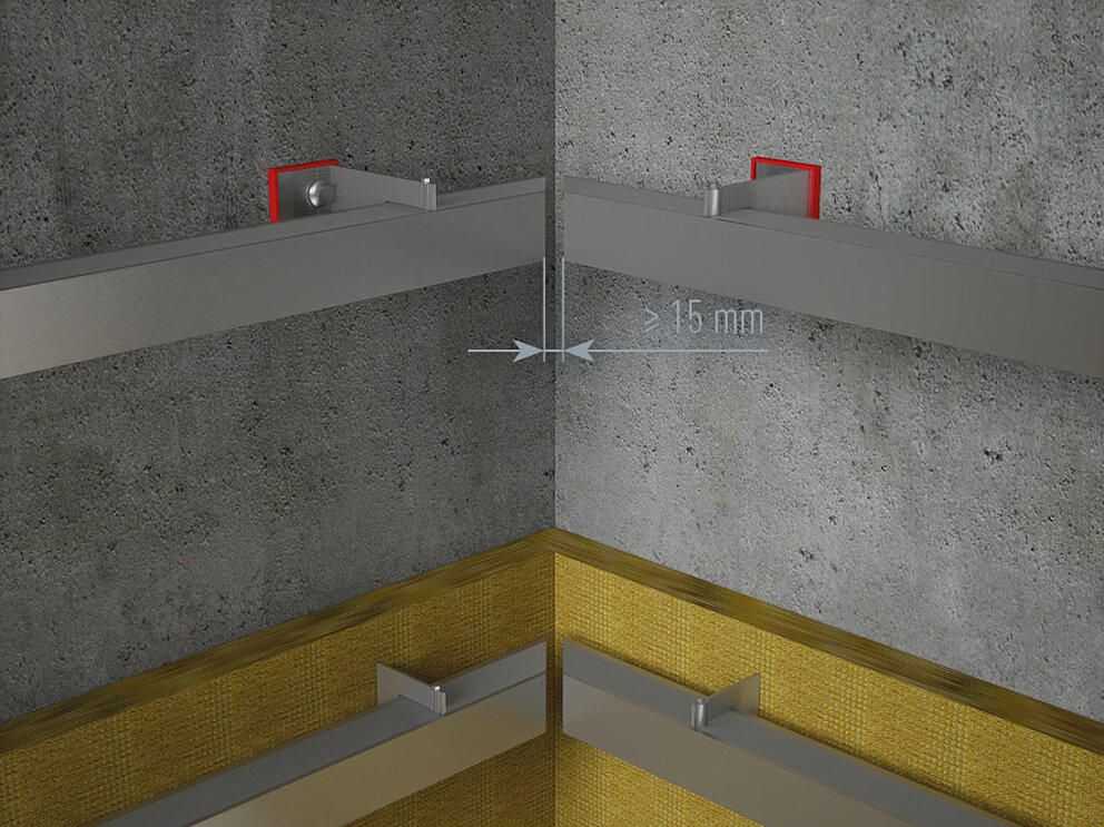 Dbejte při montáži profilů vnitřního nebo vnějšího rohu na to, aby se nosné profily spodní konstrukce v oblasti rohů nestýkaly. Dodržujte vzdálenost min. 15 mm. Při kotvení je nutné zohlednit montáž umožňující dilataci s jasně definovanými pevnými a posuvnými body.