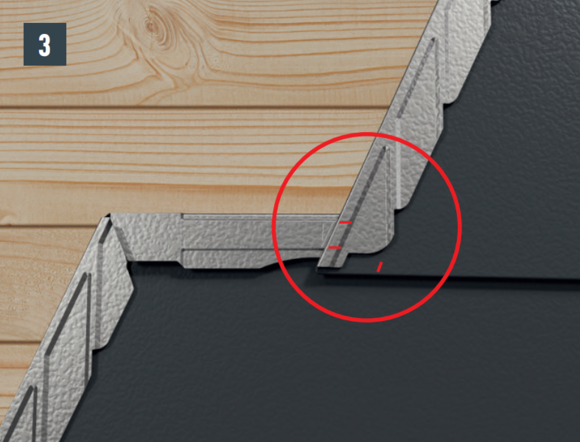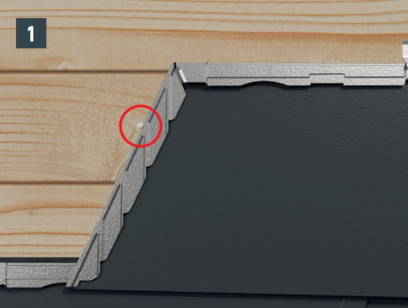 Falcovaný šindel DS.19 se kotví jednou příponkou a jedním žárově pozinkovaným hřebíkem 2,8/25 (základní kotvení).