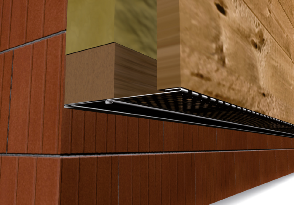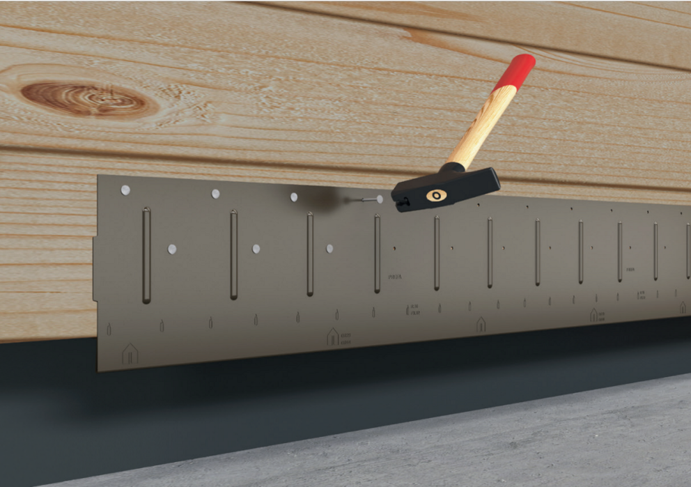 Jakmile jsou napojení pro soklovou oblast ZPF (děrovaný plech a příponek) namontována, může proběhnout montáž podkladního pásu. Podkladní pás je vždy začátkem při zhotovení fasády s maloformátovými produkty PREFA. Precizní montáž podkladního pásu je důležitá, protože zásadně ovlivňuje vzhled vaší fasády.