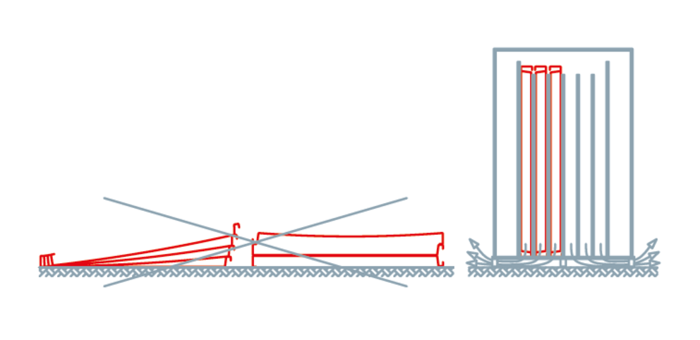 Otevřená balení nebo volně položené hliníkové prvky zabezpečte při silném větru proti pádu či odnesení. Kartonové krabice uložené na střeše chraňte před deštěm plachtou. Musí být uloženy ve svislé poloze na rovném povrchu . Skladované zboží by mělo být chráněno a skladováno na suchém místě.