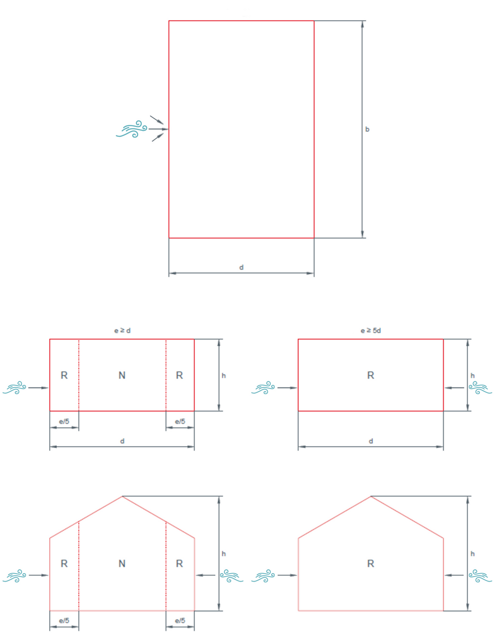 Při pokládce krytiny se stojatou drážkou je třeba přizpůsobit šířku pásů a rozteče příponek zatížení větrem specifickému pro danou budovu a oblast. Společnost PREFA vytvořila pro pokladače zjednodušené dimenzování a uvádí je v tabulkové podobě. Zjednodušené dimenzování platí výhradně pro uzavřené konstrukce a pouze pro PREFALZ nebo FALZONAL® v kombinaci s pevnými a posuvnými příponkami PREFA a souvisejícími upevňovacími prostředky (hřebíky/šrouby) od PREFA, jakož i při pokládce na plné bednění. Tabulky vycházejí z normy EN 1991-1-4. Kategorie oblasti se převezme z normy EN 1991-1-4 a základní rychlost z národních doplňků normy EN 1991-1-4. Plochy fasád byly optimalizovány na dvě plochy a přejmenovány (R = okrajová plocha, N = normální plocha). Zatížení větrem je největší na okrajích budov a vyžaduje zvláštní pozornost.