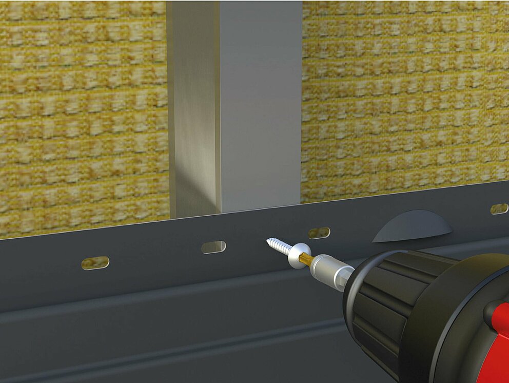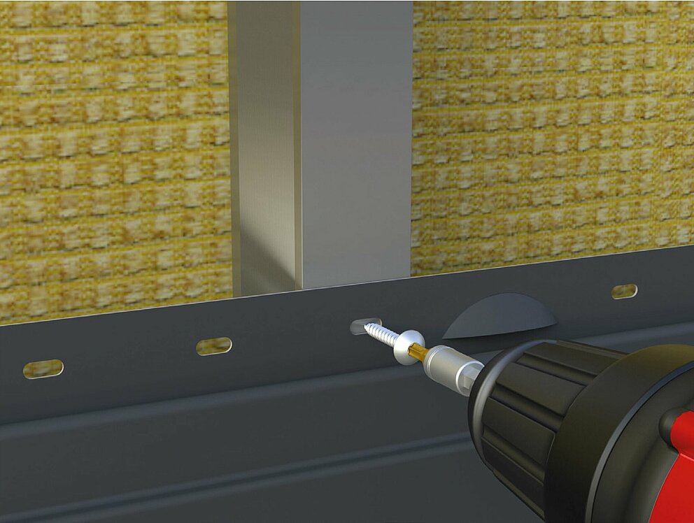 Upevňovací vrut se zašroubuje středem skrz předem vyražený podlouhlý otvor na kotevním jazýčku do nosného profilu. Pokud se přímo nad nosným profilem SK nenachází předem vyražený podlouhlý otvor, je nutné např. pomocí kleští na podlouhlé otvory vytvořit podlouhlý otvor, aby se umožnila roztažnost Sidingu bez pnutí.