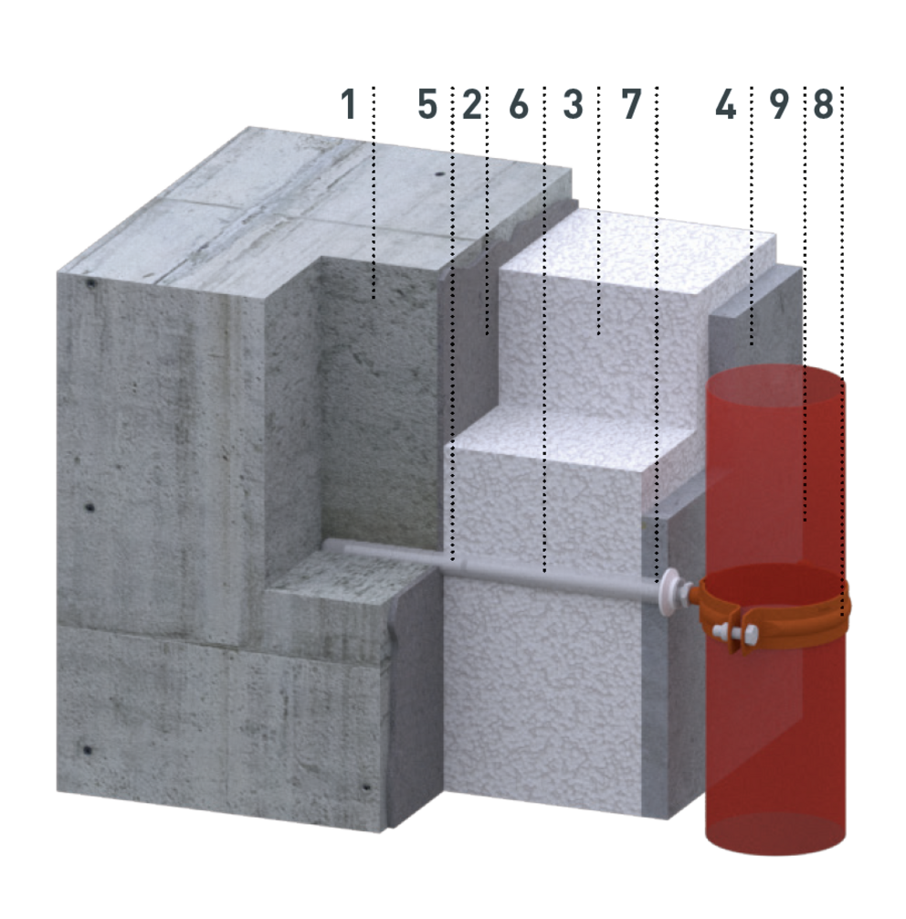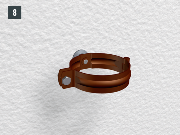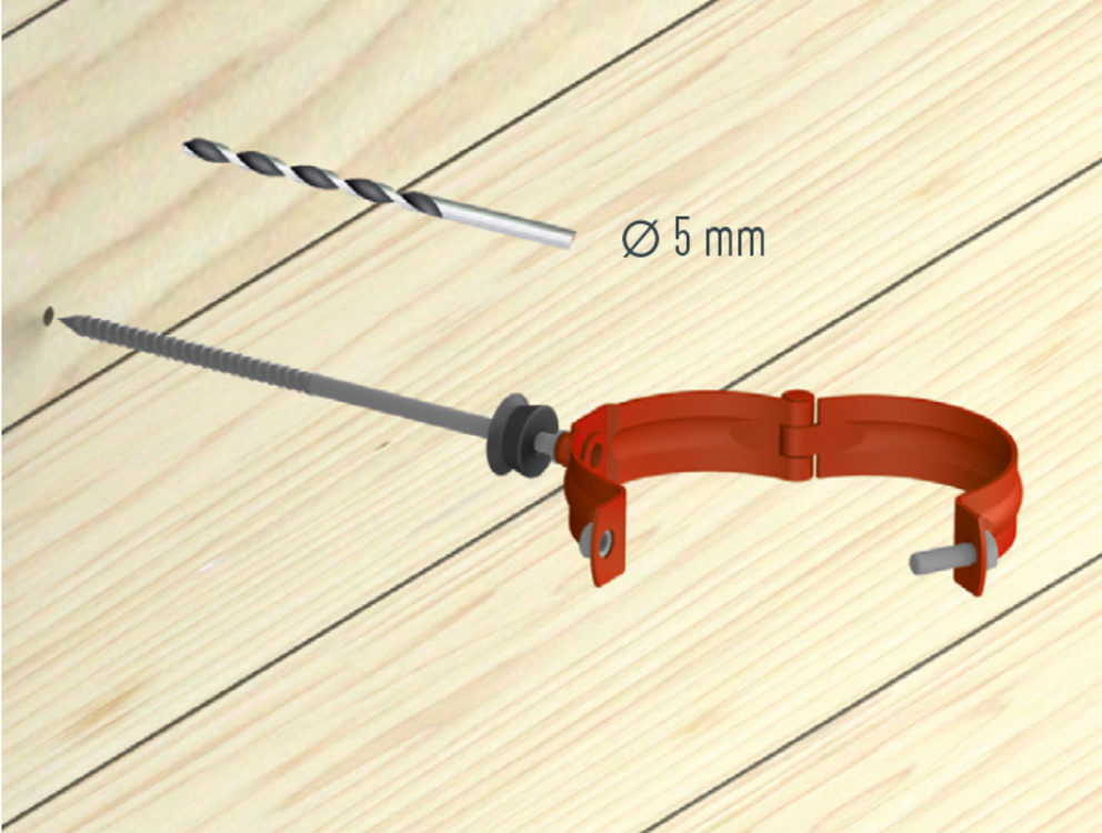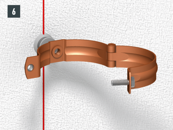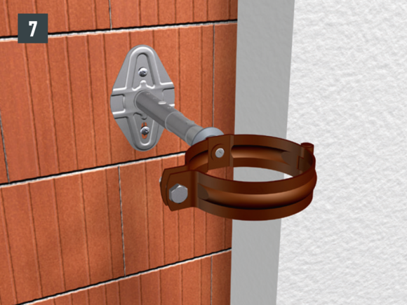 Montáž kruhových svodů s objímkami. Podle podkladu (fasádní plocha) vyberte vhodné upevňovací prostředky pro objímky.