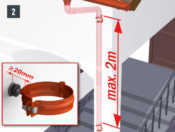 Objímky namontujte tak, aby byla dodržena min. vzdálenost 20 mm mezi zadní stranou svodu a fasádou. Vzájemná vzdálenost objímek by neměla činit více než 2 m. (Národní normy a profesní pravidla mohou připouštět větší vzdálenosti. Vzhledem k délce svislých svodů PREFA 3 m se osvědčila vzdálenost max. 2 m.)