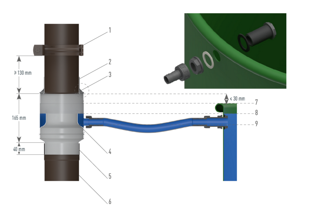 Sběrač dešťové vody při srážkách plní sud dešťovou vodou přímo odtokovým potrubím a shromažďuje vodu až k požadované výšce.
