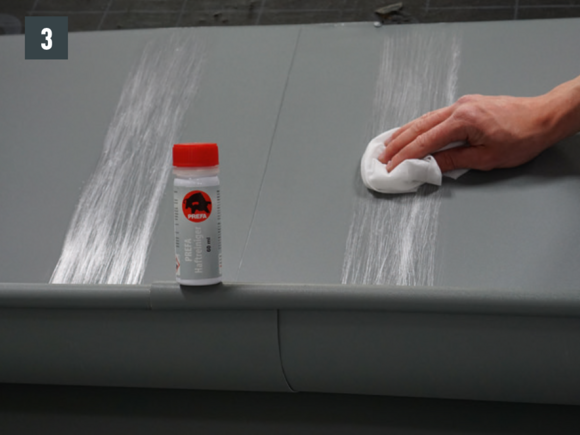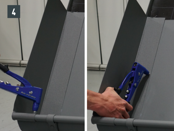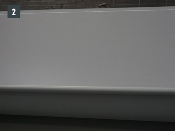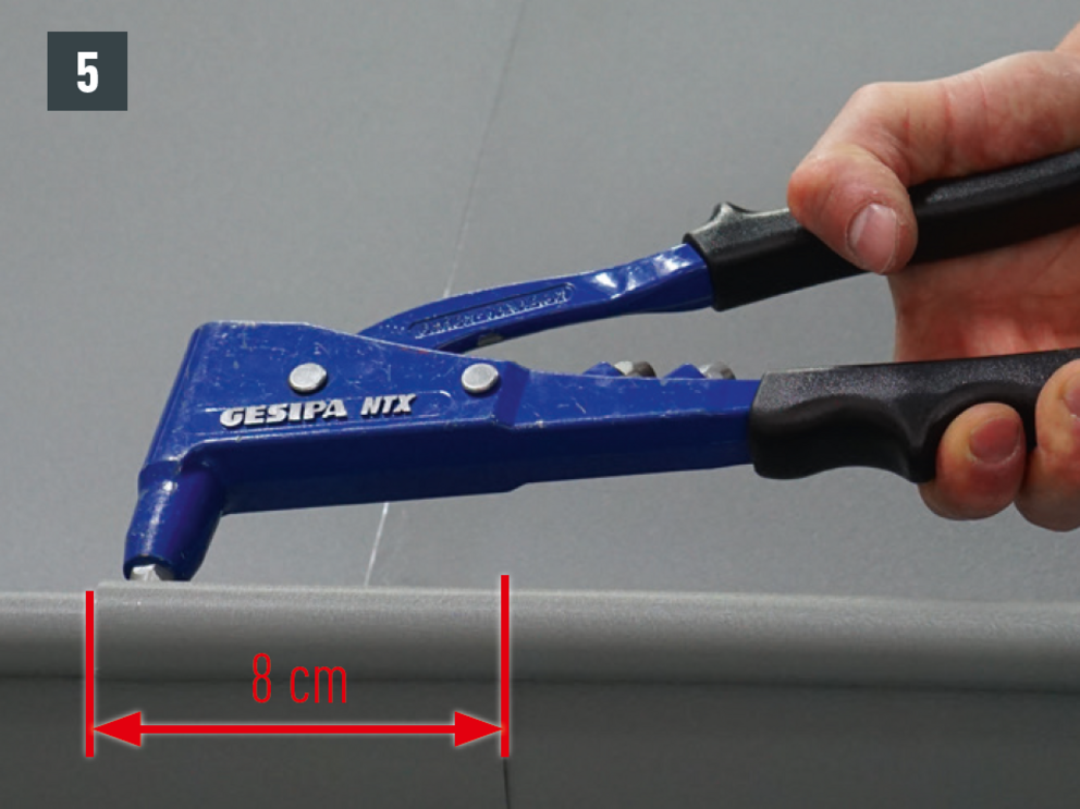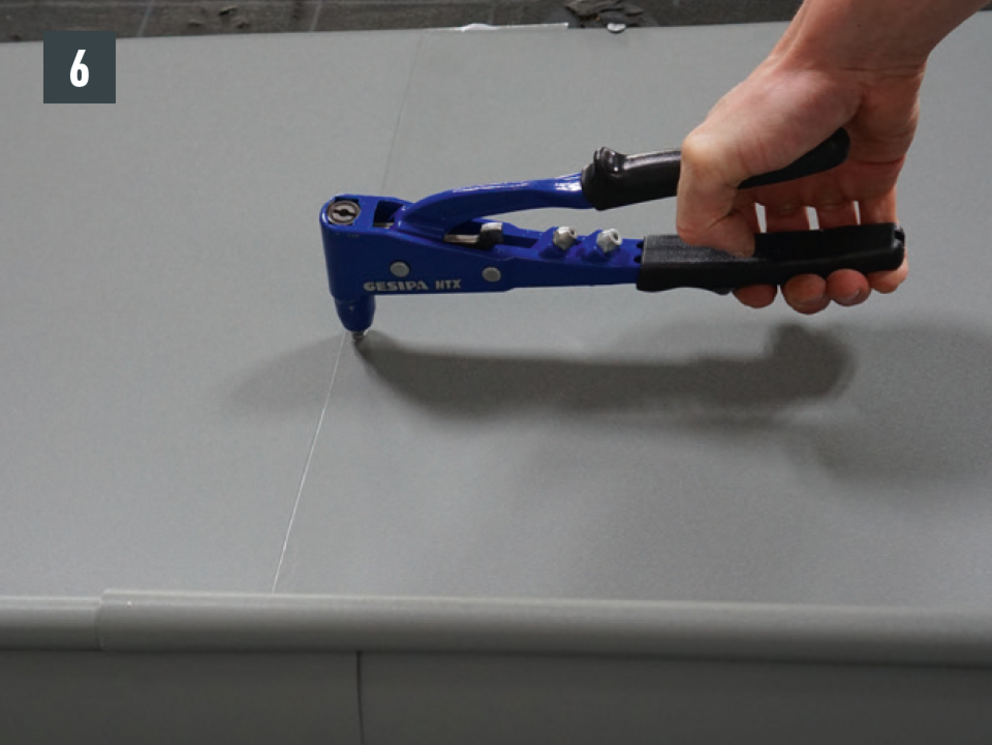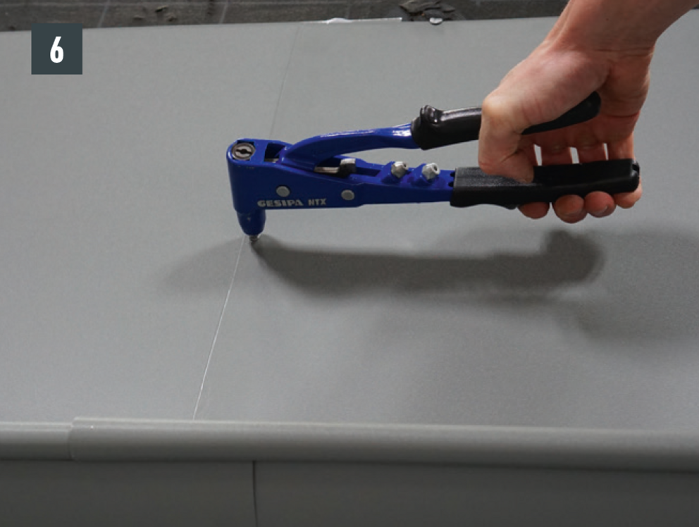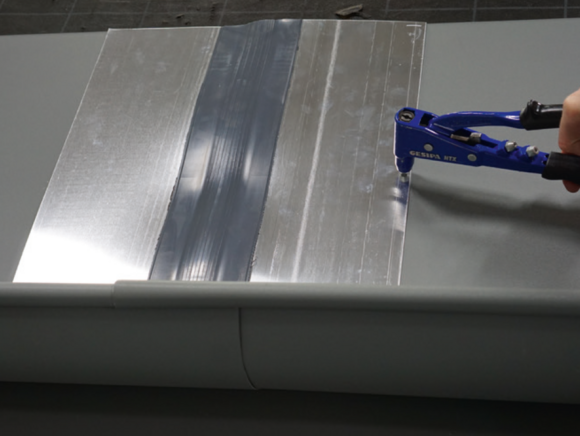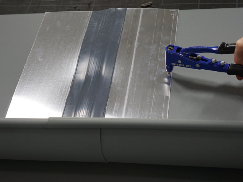 Spojení nástřešního žlabu může být také vytvořeno jako nýtové spojení s 20 kusy patentovaných nýtů PREFA 4 x 9,5 mm v křížovém stehu a jako utěsnění pomocí speciálního silikonu PREFA.