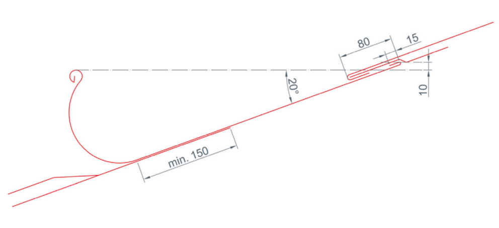 Dbejte, aby zadní přídavná drážka na straně střechy ležela o 10 mm výše než přední strana nástřešního žlabu. Z toho v případě nástřešního žlabu PREFA vyplývá minimální sklon střechy 20° (viz obrázek níže).