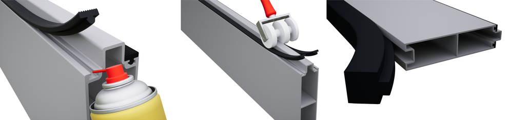 • Těsnění hrázního bloku vtlačte do obou drážek na horní straně hrázního bloku. Jako montážní pomůcku lze pro snazší vtlačení použít pomůcku k instalaci těsnění do hrázních bloků a silikonový sprej. Spodní těsnění připevněte na spodní stranu hrázního bloku.