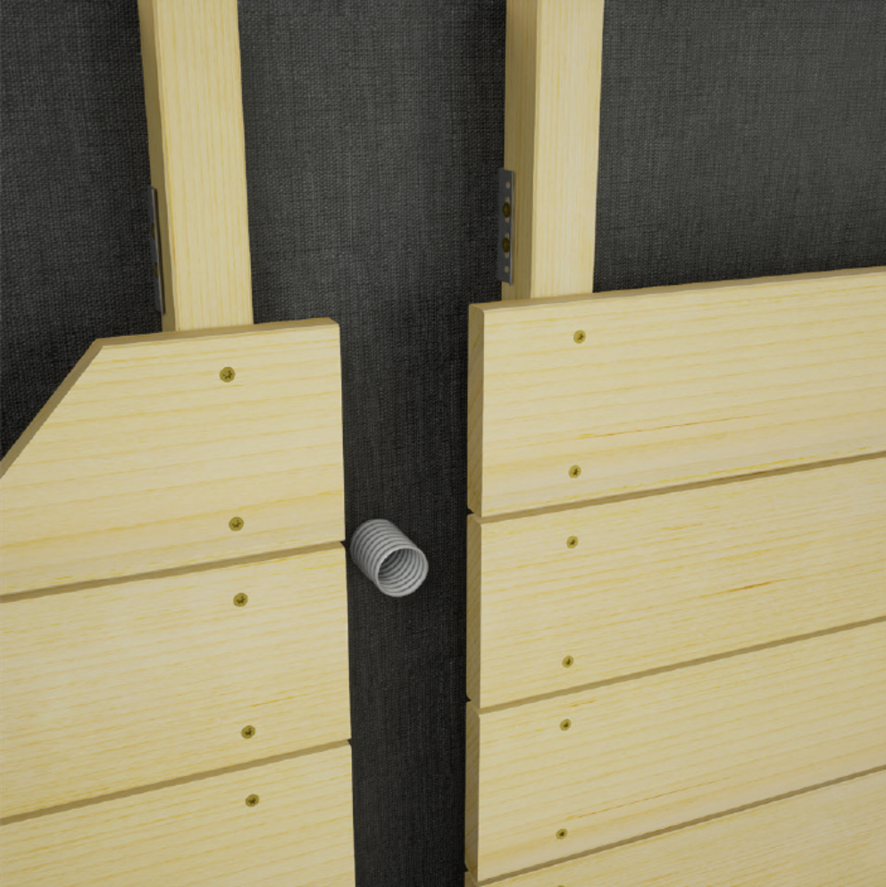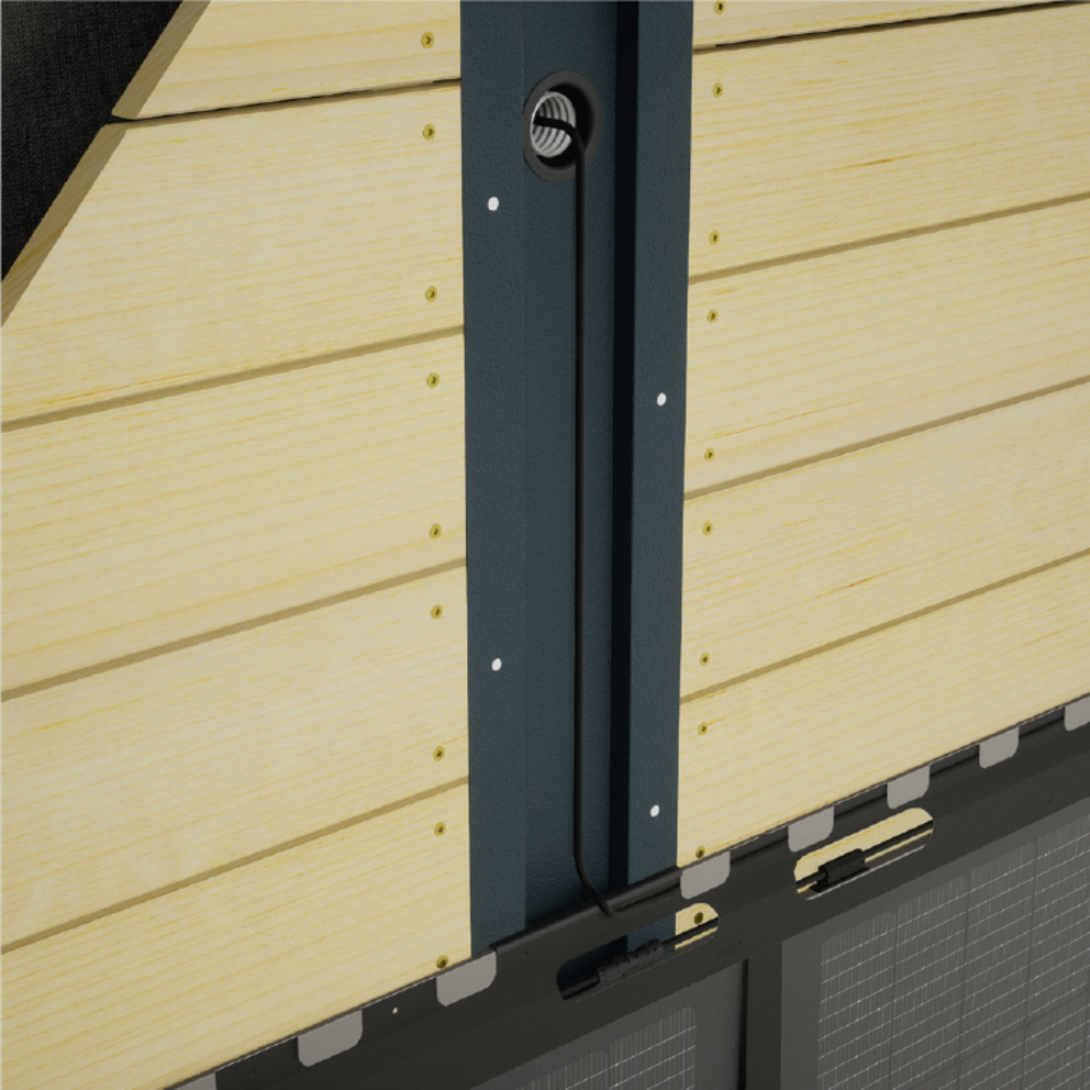 V oblasti stěnové průchodky musí být umístěn kabelový kanál z doplňkového fasádního svitku. Přitom je třeba dbát na to, aby bylo dřevěné bednění v této oblasti odpovídajícím způsobem vyříznuto, aby kabelový kanál přesně zapadl do stěny a byl s ní v jedné rovině.