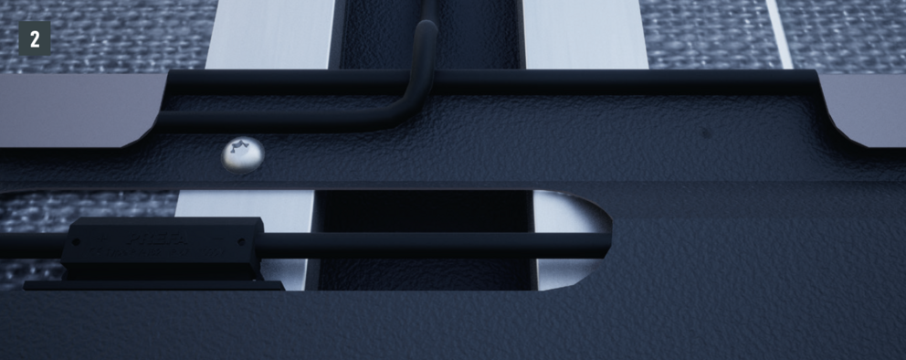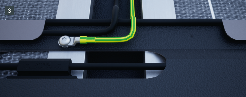 Solární střešní panely, které leží nad kabelovým kanálem, musí být navíc sešroubovány šroubem s čočkovitou hlavou (viz obr. 2). Proto musí být kabelový kanál opatřen hliníkovým oplechováním k vytvoření dodatečného vertikálního vodivého spojení mezi solárními střešními panely.