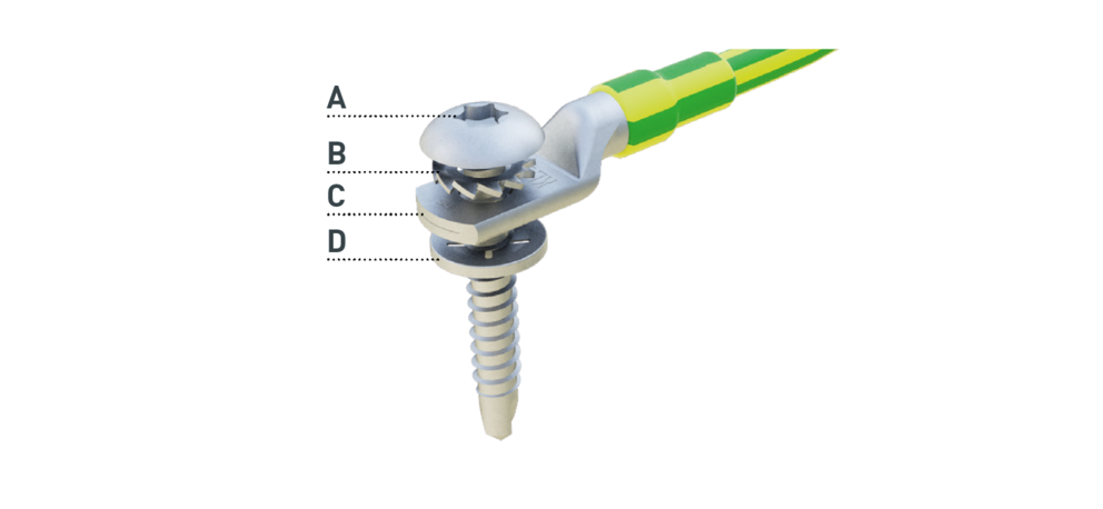 Konstrukční díl dále sestává z montážního šroubu (A), pojistné ozubené podložky (B), nerezového kontaktu (C) a jištění šroubu (D) (viz obrázek níže).