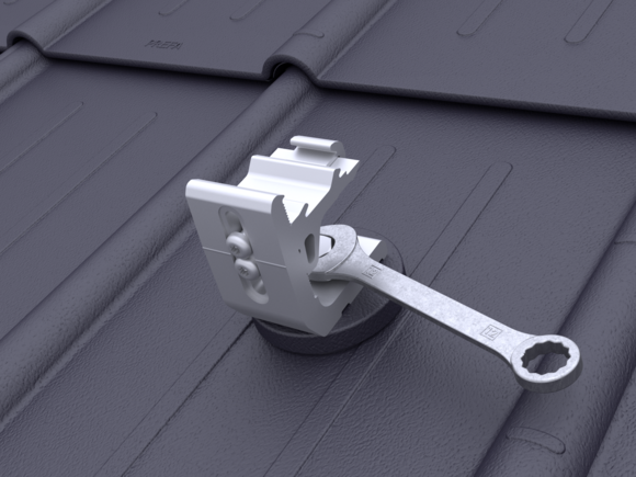 Připevněte krytky, nasaďte základní těleso na kruhovou podložku a následně upevněte šestihranným šroubem (otevřený klíč: vel. 18). PREVARIO 3.S je vhodný k montáži na maloformátové krytiny PREFA.