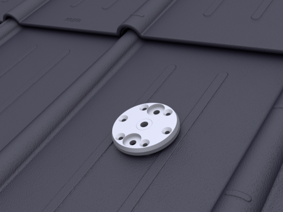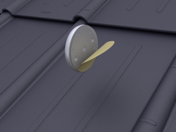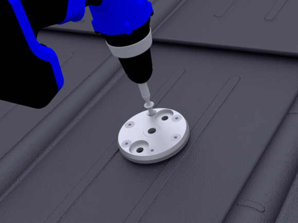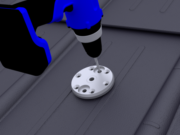 Přišroubování kruhové podložky vždy 2 upevňovacími vruty ⌀ 8×220 mm (dvouplášťová skladba střechy) nebo ⌀ 8×120 mm (jednoplášťová skladba střechy) do krokví, dokud není plošné těsnění přitlačeno ke střešní krytině a spodní konstrukci. Při správném provedení se ploché těsnění směrem ven mírně vyboulí (nástavec vrtačky: T40).