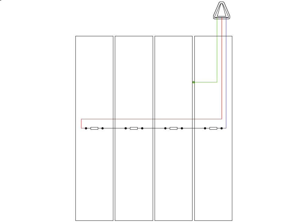 Systém solárních panelů PREFALZ vyžaduje pro každý string jeden přívod a jeden vývod. V následujícím schématickém náčrtu kabeláže je k lepšímu porozumění přívod zobrazen modře, vývod červeně, vyrovnání potenciálů zeleně a vedení panelů černě.