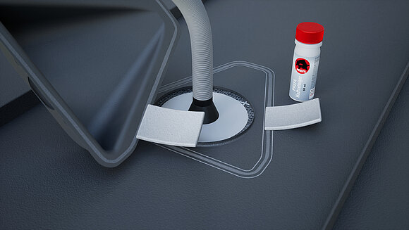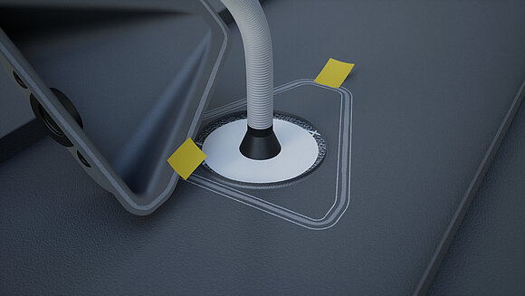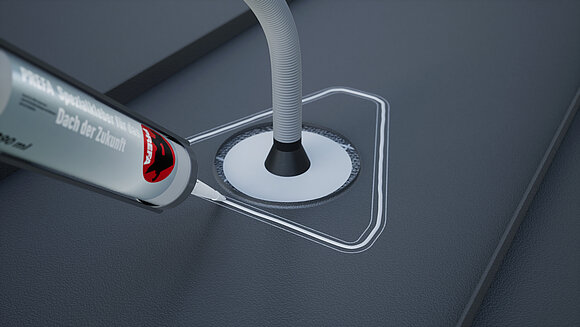 Naneste speciální lepidlo po obvodu a protáhněte vlnitou hadici průchodkou. Následně nasaďte solar haubnu a přitlačte ji uprostřed.