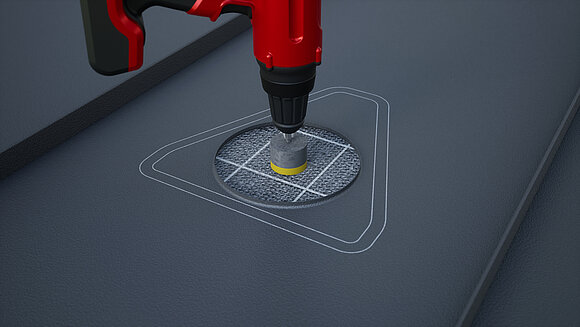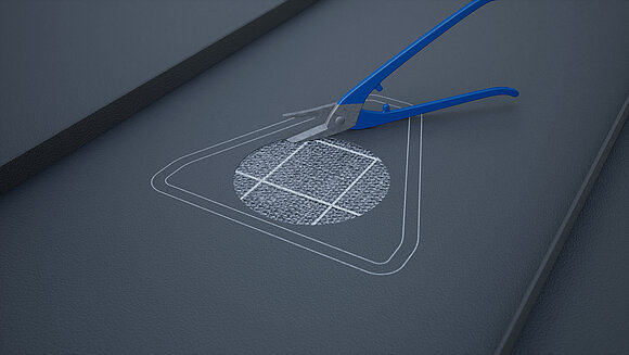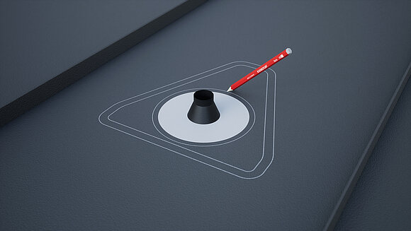 Umístění solar haubny a vyznačení obrysu. Následně vyznačte oblast lepení (25 mm) a výřez trubkové manžety. Vyřezání a vytažení okraje kruhové oblasti.