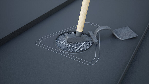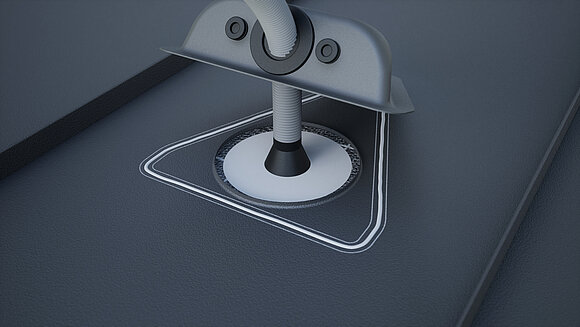 Vyvrtejte otvor v potřebném průměru, nalepte trubkovou manžetu a prostrčte vlnitou hadici. Lepené plochy lehce obruste, očistěte a nechte zaschnout. Průchodku propíchněte šroubovákem.