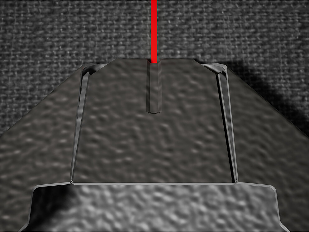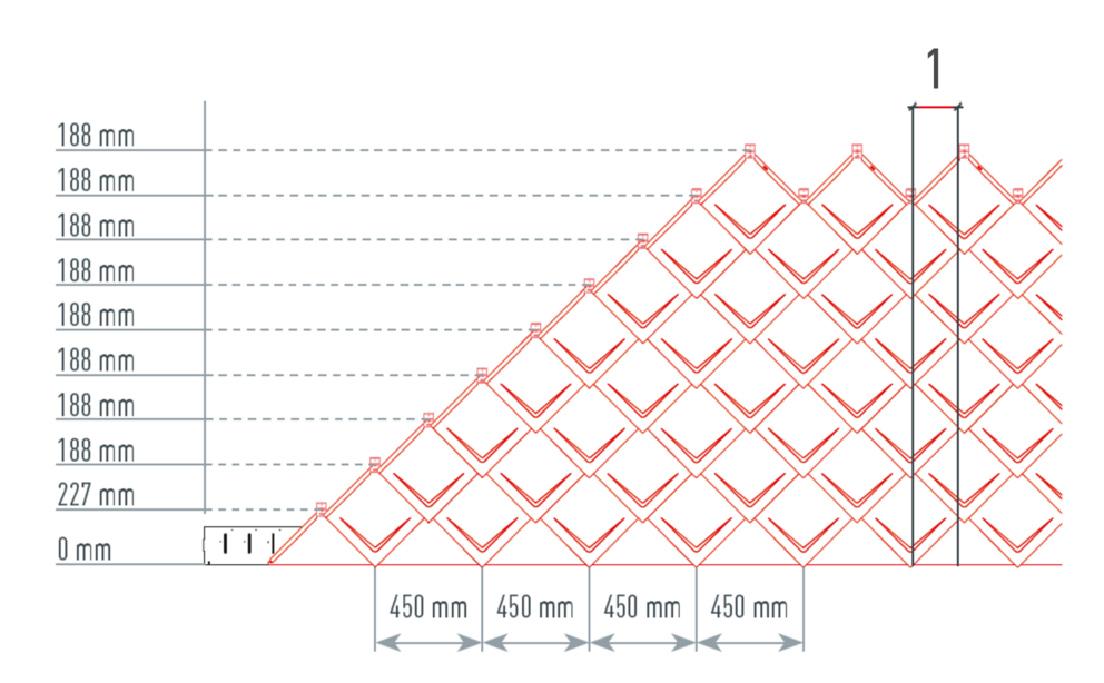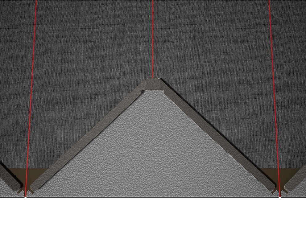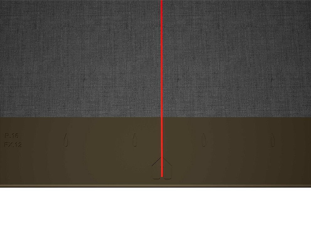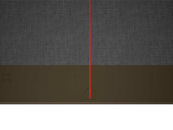 Jako pomůcku při pokládce PREFA falcovaných šablon 29 × 29 se doporučuje použít vertikální šňůrování s roztečí 450 mm (pomůckou jsou značky v podkladním pásu). Pro přesné dodržení šňůrování v každé řadě lze případně vyznačit i poloviční rozměr šňůrování a v pravidelných odstupech ho kontrolovat. Srovnejte startovací šablony se zářezy (na horní hraně startovacích šablon) podle vertikálního šňůrování (viz obrázek dole). Dbejte přitom, aby se oblast určená pro boční napojovací ohyb (např. pro napojení štítové lišty) nenacházela ve středu šablon 29 × 29 (hlídejte si symetrii/střed střechy).