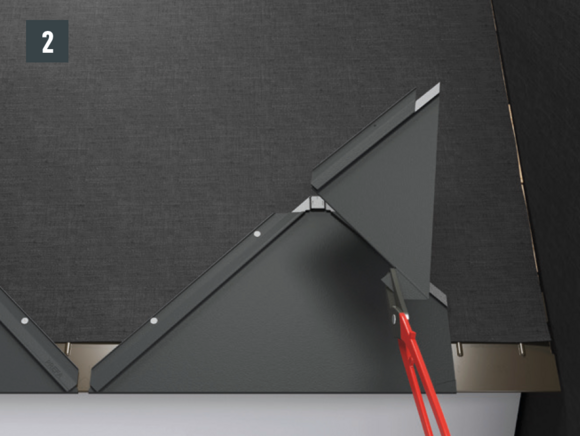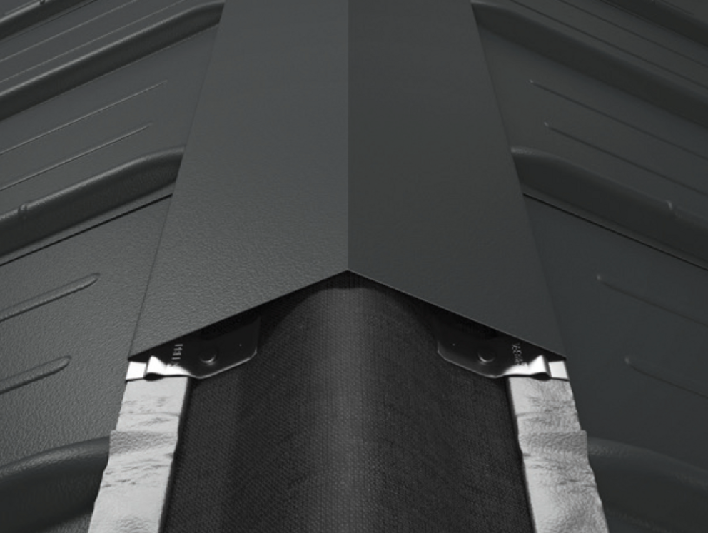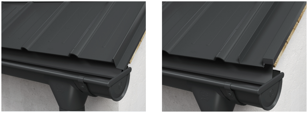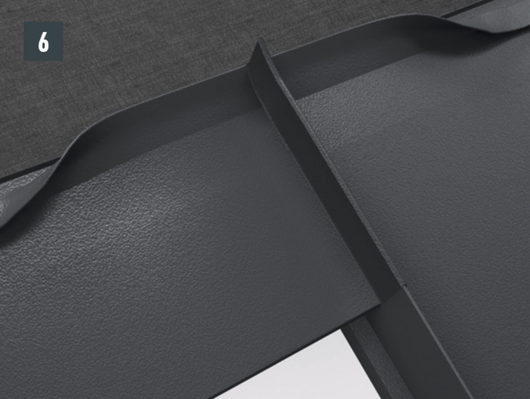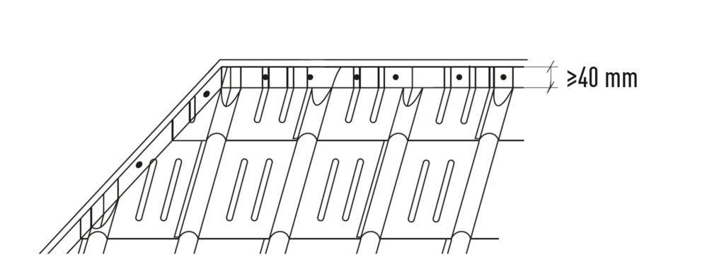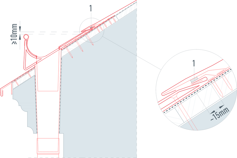 Pro ochranu střechy před zafoukáním prachového sněhu je bezpodmínečně nutné v oblasti nároží a hřebene krytinu PREFA minimálně 40 mm zvednout.