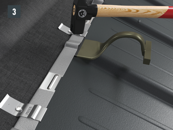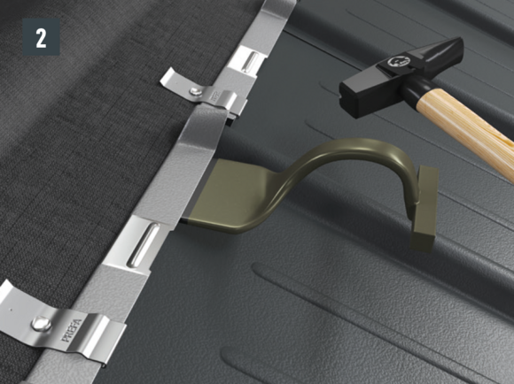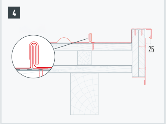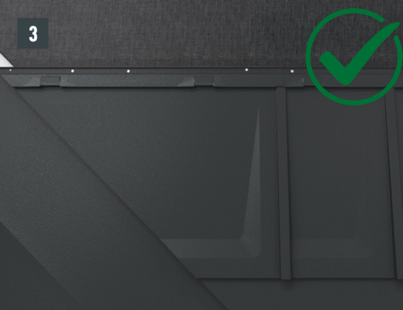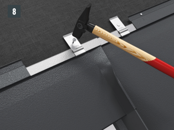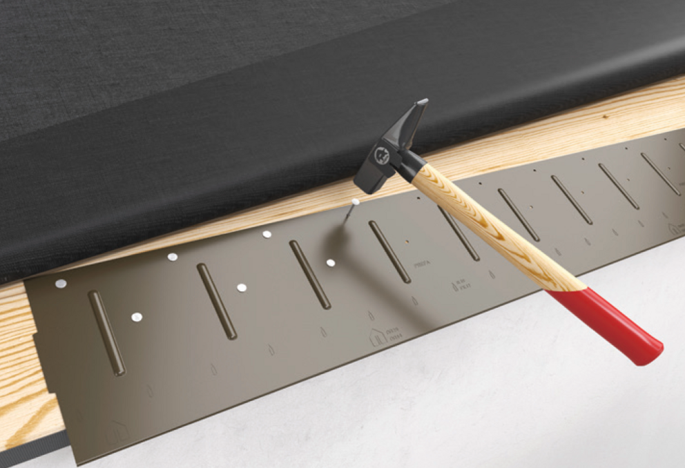 Podkladní pás připevněte ve všech malých vyražených otvorech hřebíky PREFA, které jsou součástí dodávky.