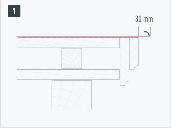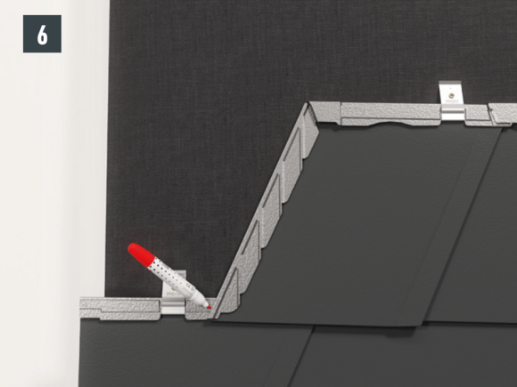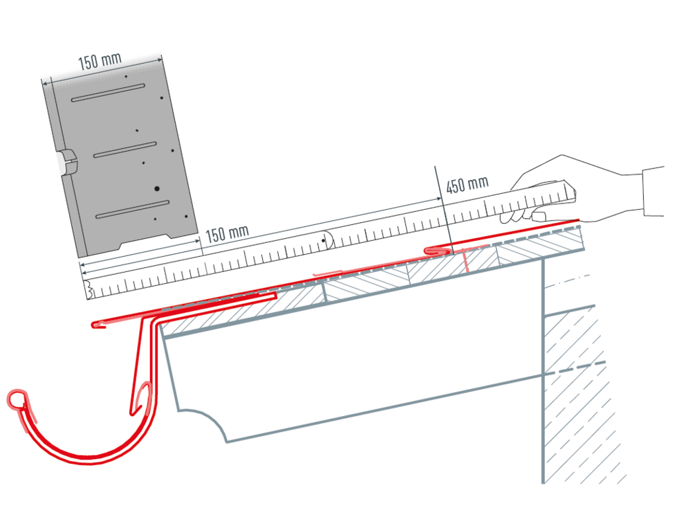 Naměřte od plánované horní hrany první falcované střešní tašky 450 mm směrem k okapu (dbejte na to, aby přesah okapní hrany byl v rozmezí 30 až 80 mm). Označte ve vzdálenosti 150 mm (šířka podkladního pásu) zdola horní hranu podkladního pásu.