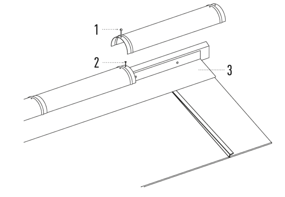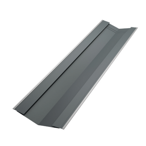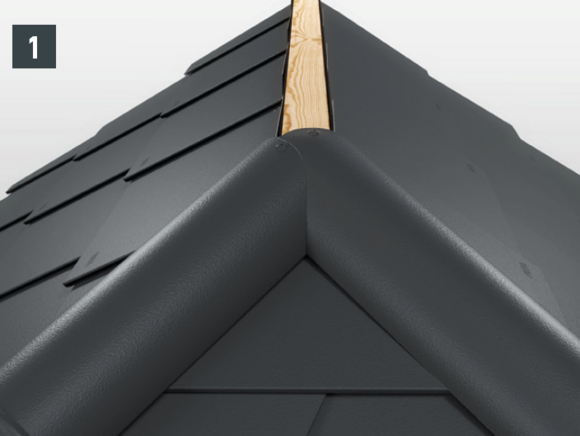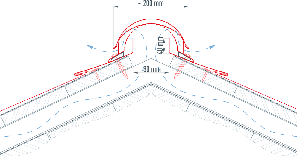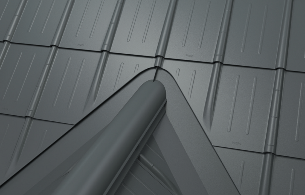 Jednoduchý hřeben ze svitkového plechu lze použít tehdy, pokud je vzdálenost mezi střešní krytinou PREFA a vrcholem hřebene menší než 150 mm a není nutné odvětrání.