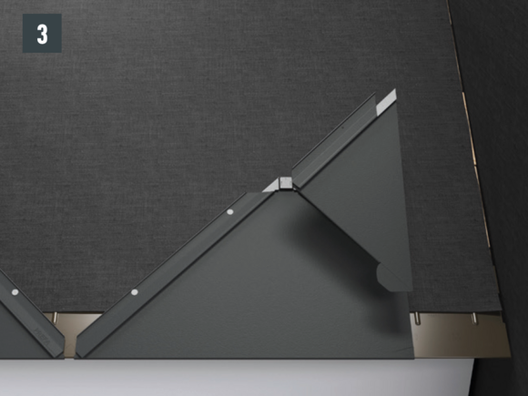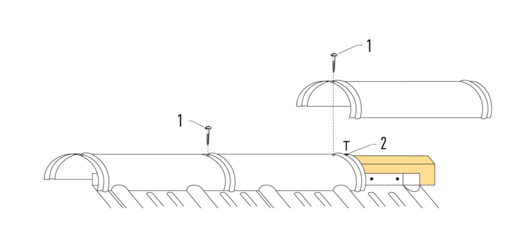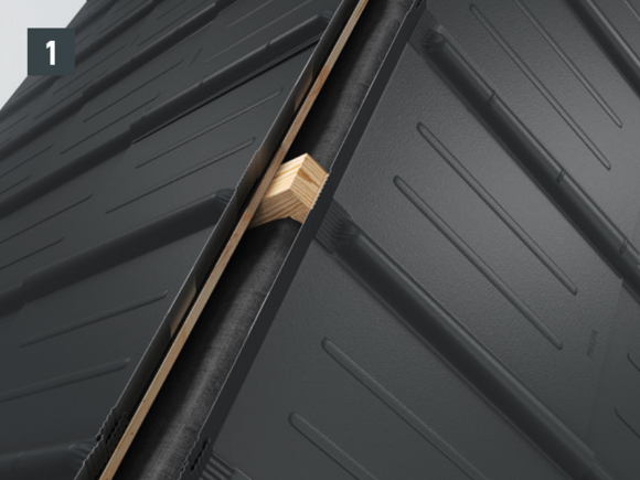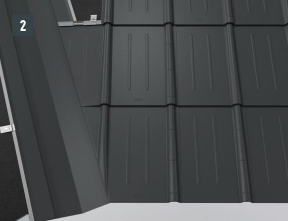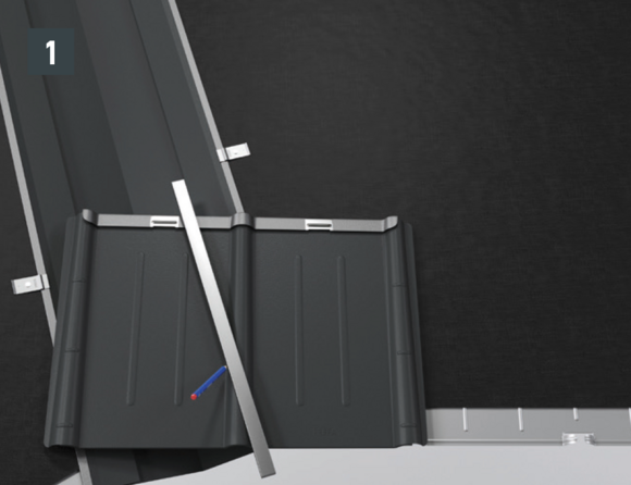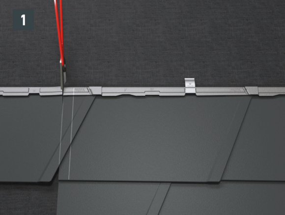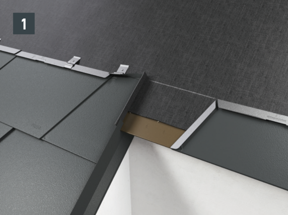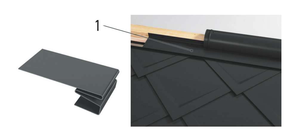 Mezi ukončovacími (hřebenovými) taškami pro falcovanou šablonu 29 × 29 je třeba namontovat dodaný příponek (1).