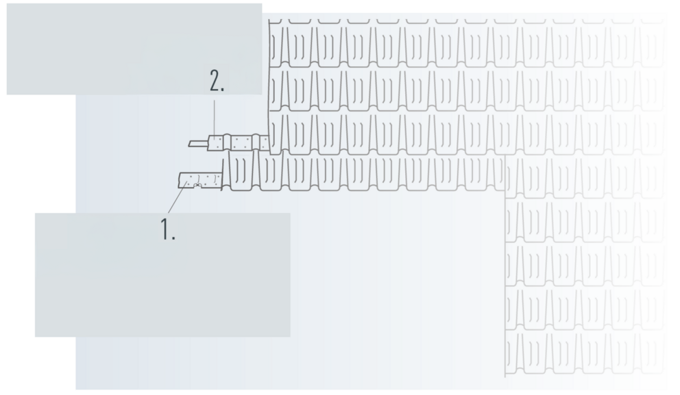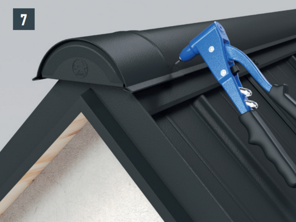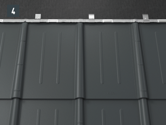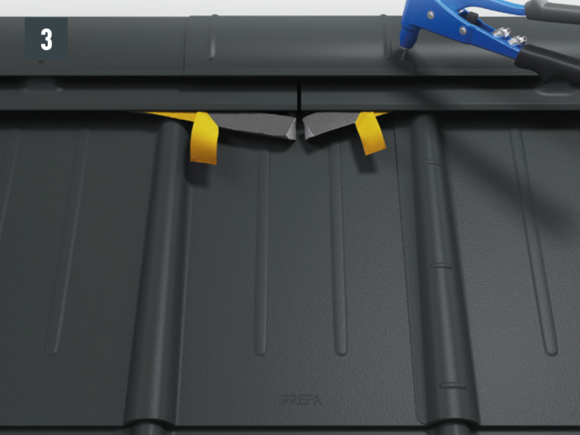Poslední (v případě potřeby nařezanou) řadu desek ukotvěte pomocí zpětné příponky, přímým kotvením z boku na vrcholu vlny podkladní vlny (u PREFA falcovaných tašek) nebo přímým kotvením nad pěnovým klínem odvětrávacího hřebene Jet-Lüfter.