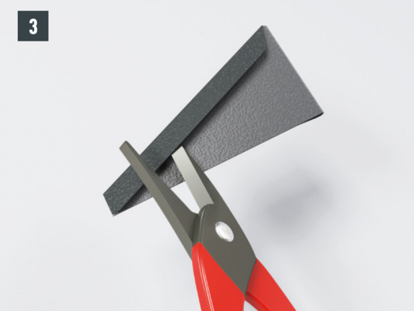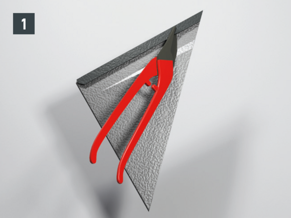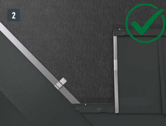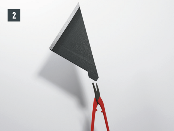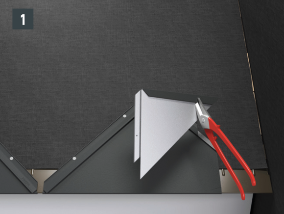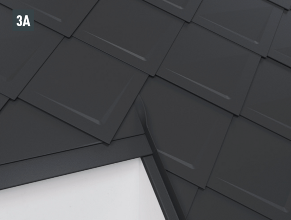 U každého bočního zdvihu falcované šablony 44 × 44 (závětrná lišta a lemování komínu) je nutno drážky směřující šikmo směrem dolů na spodní straně vystřihnout a vyhnout.