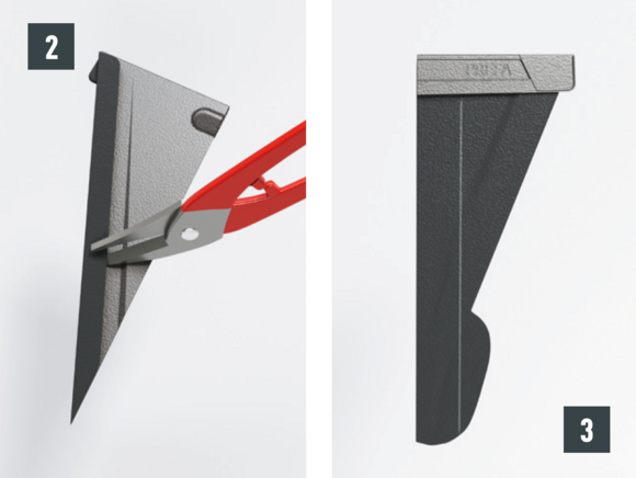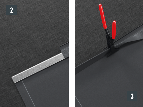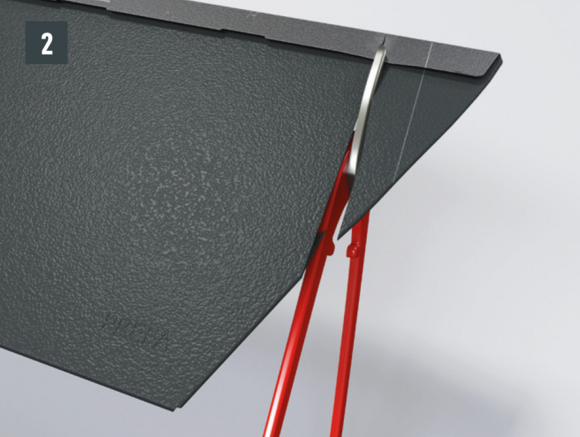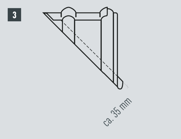 V oblasti bočního zdvihu vyřízněte horní patentovou drážku tak, aby zůstala háková drážka (obrázek 1 a 2), a ohněte střešní panel R.16 nebo střešní panel FX.12 o 30 mm v pravém úhlu vzhledem k ploše střechy.