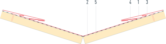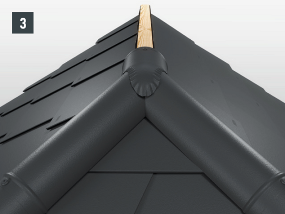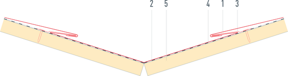 Když průsečík úžlabí/spáry šindele vlevo splývá s úžlabím, je u falcovaných šindelů DS.19 nutné předem namontovat falcovaný šindel DS.19 (1).