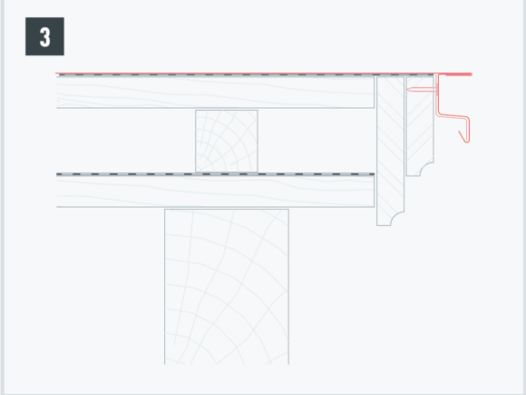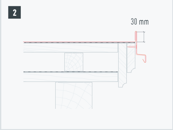 Přesah podkladního pásu přes okapovou hranu by měl být v zadní třetině šířky žlabu a nesmí být větší než 80 mm.