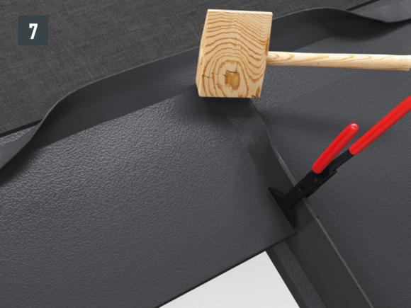Namontujte falcovaný šindel pro napojení, nařežte s přídavkem pro drážku 30 mm a ohněte (obrázek 8 a 9).