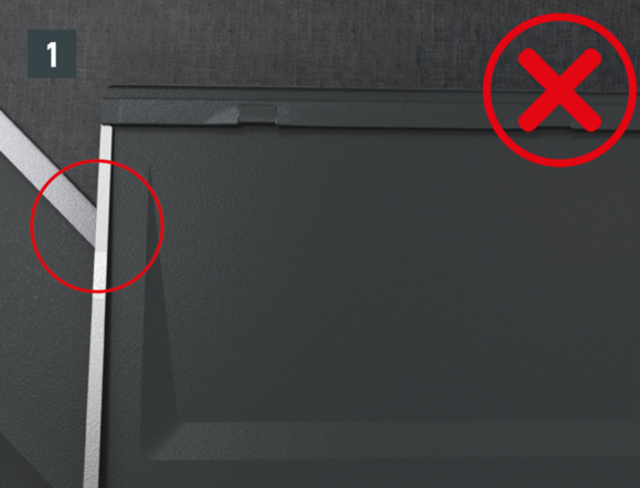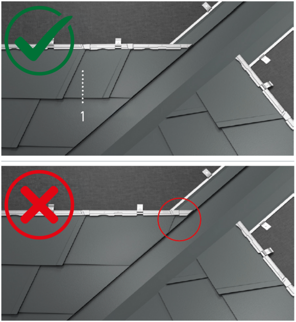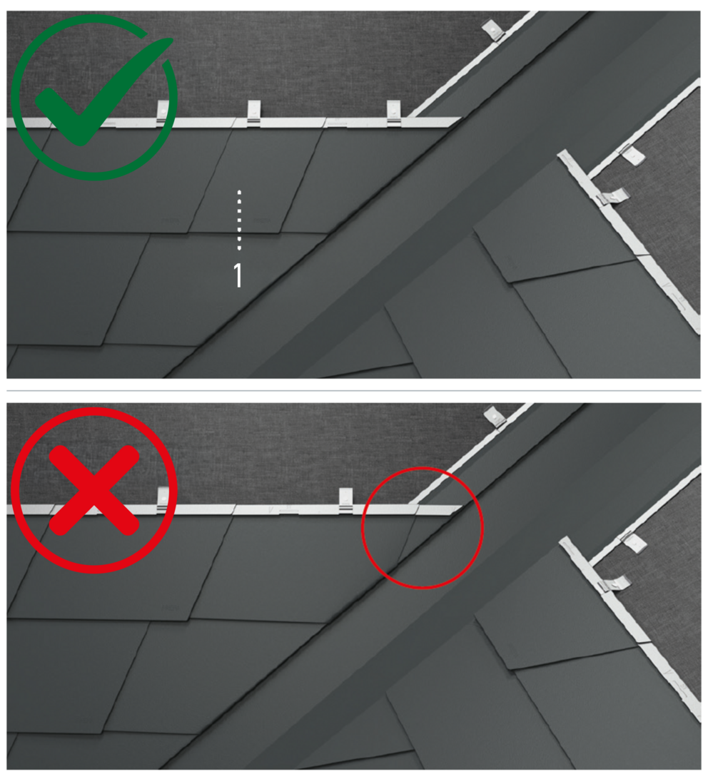 Když průsečík úžlabí/spáry šindele vlevo splývá s úžlabím, je třeba u falcovaných šindelů předem vyrobit a namontovat zkrácený falcovaný šindel (1), popř. falcovaný šindel pro napojení (1).