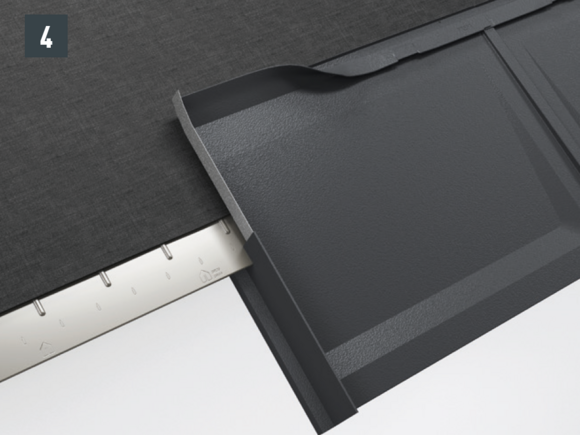 Dbejte přitom, aby se oblast určená pro boční napojovací ohyb (např. pro napojení štítové lišty) nenacházela v oblasti drážky střešního panelu R.16 resp. střešního panelu FX.12. Podkladní pás případně o jednu čtvrtinu rozměru střešního panelu R.16 resp. střešního panelu FX.12 posuňte.