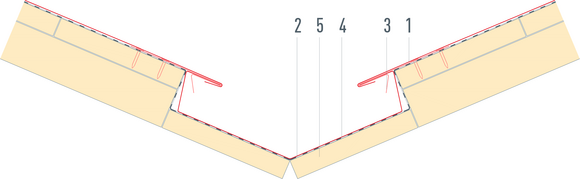 Při použití PREFA bezpečnostního úžlabí může být napojení úžlabí provedeno s průsečíkem úžlabí/styk panelů.