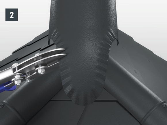 Při napojení odvětrávacího hřebene Jet-Lüfter k úžlabí je třeba odvětrávací hřeben Jet-Lüfter utěsnit ukončovacím prvkem a musí být provedeno tak, aby se do odvětrávacího hřebene Jet-Lüfter nedostala srážková voda z hlavní střešní plochy.