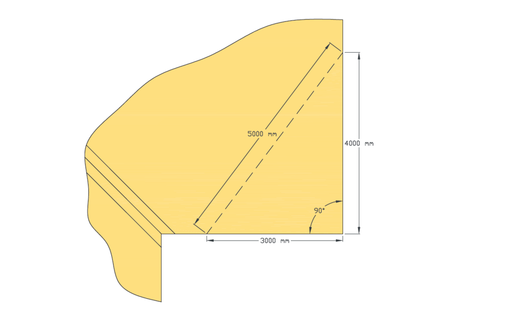 Nejprve vyznačte požadovaný vrchol. Poté podél hrany, na níž má vzniknout pravý úhel, vyznačte úsečku o délce 3 m. Ze stejného vrcholu nyní přibližně v požadovaném směru pravého úhlu odměřte úsečku o délce 4 m.