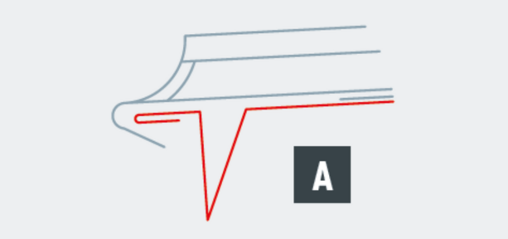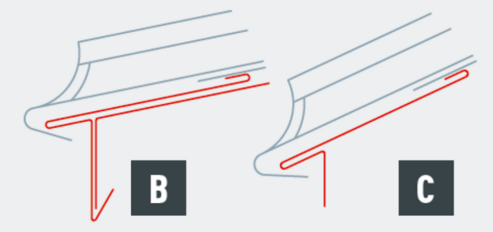 Podkladní pásy (okapové pásy) o tloušťce min. 1,0 mm (např. obr. A). Podkladní pásy (okapové pásy) o tloušťce 0,7 mm s výztužným pásem min. 0,8 mm (např. obr. B).