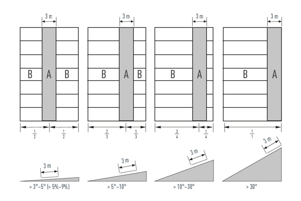 Délka oblasti pevného připnutí má být 3 metry. Polohu oblasti pevného připnutí je třeba vždy volit v závislosti na sklonu střechy – viz obrázek dole a související tabulka. Průniky nebo tvar střechy mohou ovlivnit polohu oblasti připnutí. Plochy s různou polohou oblasti připnutí musí být odděleny oddělovacími lištami.