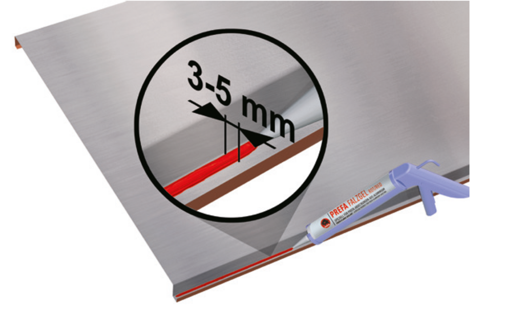 Čím nižší je sklon střechy, tím větší je riziko, že voda – například v podobě přívalového deště, sněhu nebo zpětného vzdutí – pronikne přes drážku pod kovovou krytinu. Při sklonu střechy do 7° jsou proto nutná zvláštní opatření k utěsnění, např. použití PREFA falcovacího gelu.