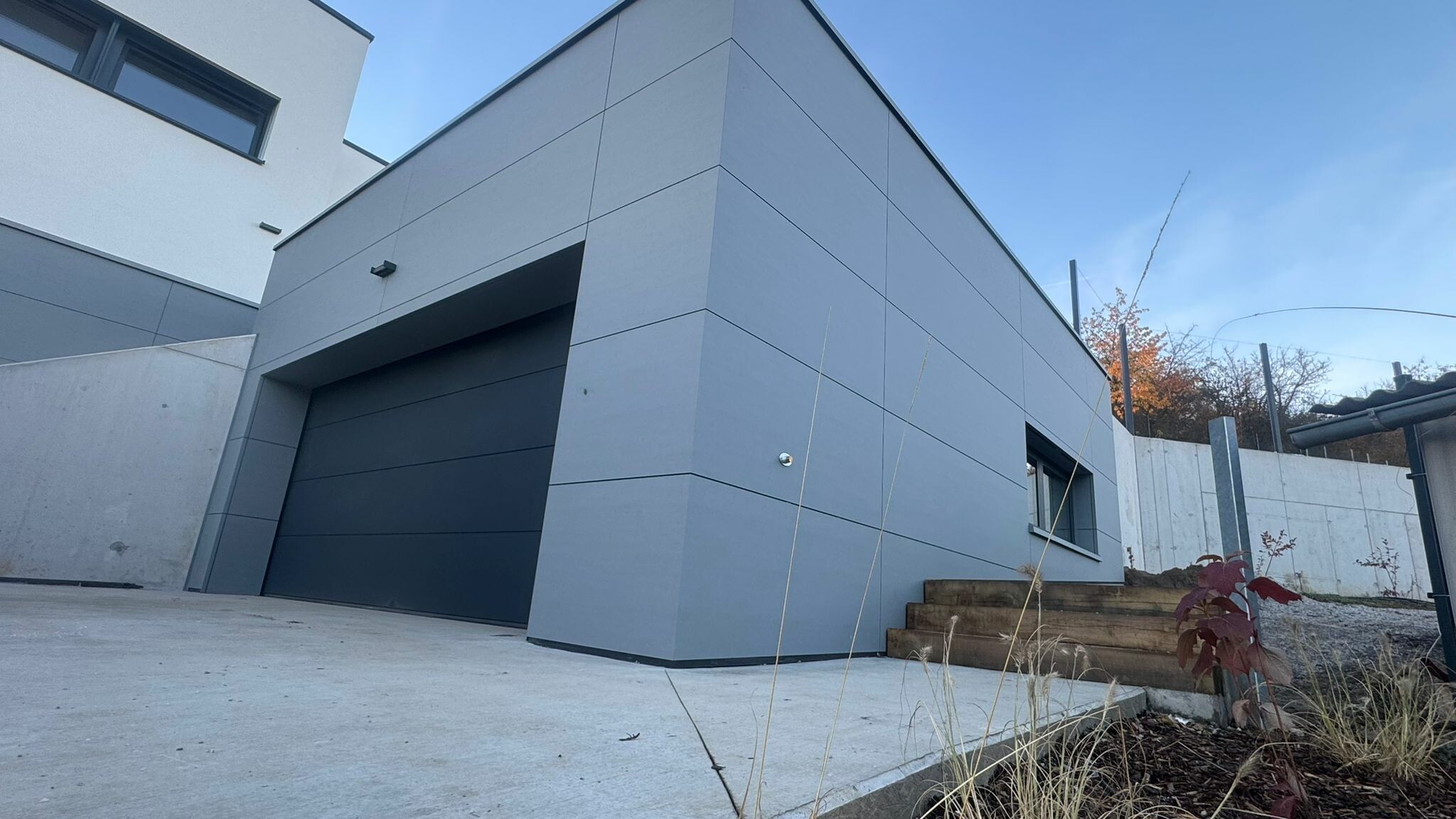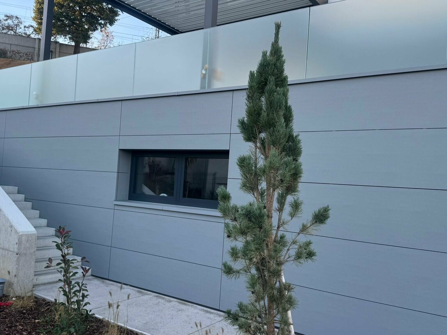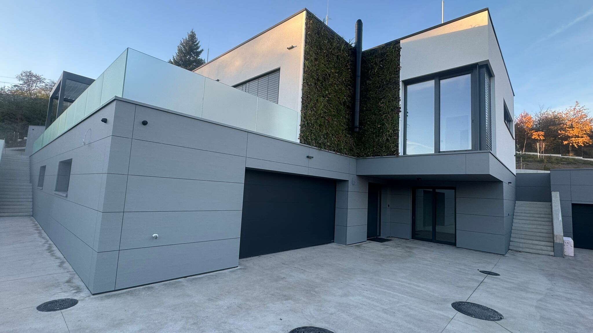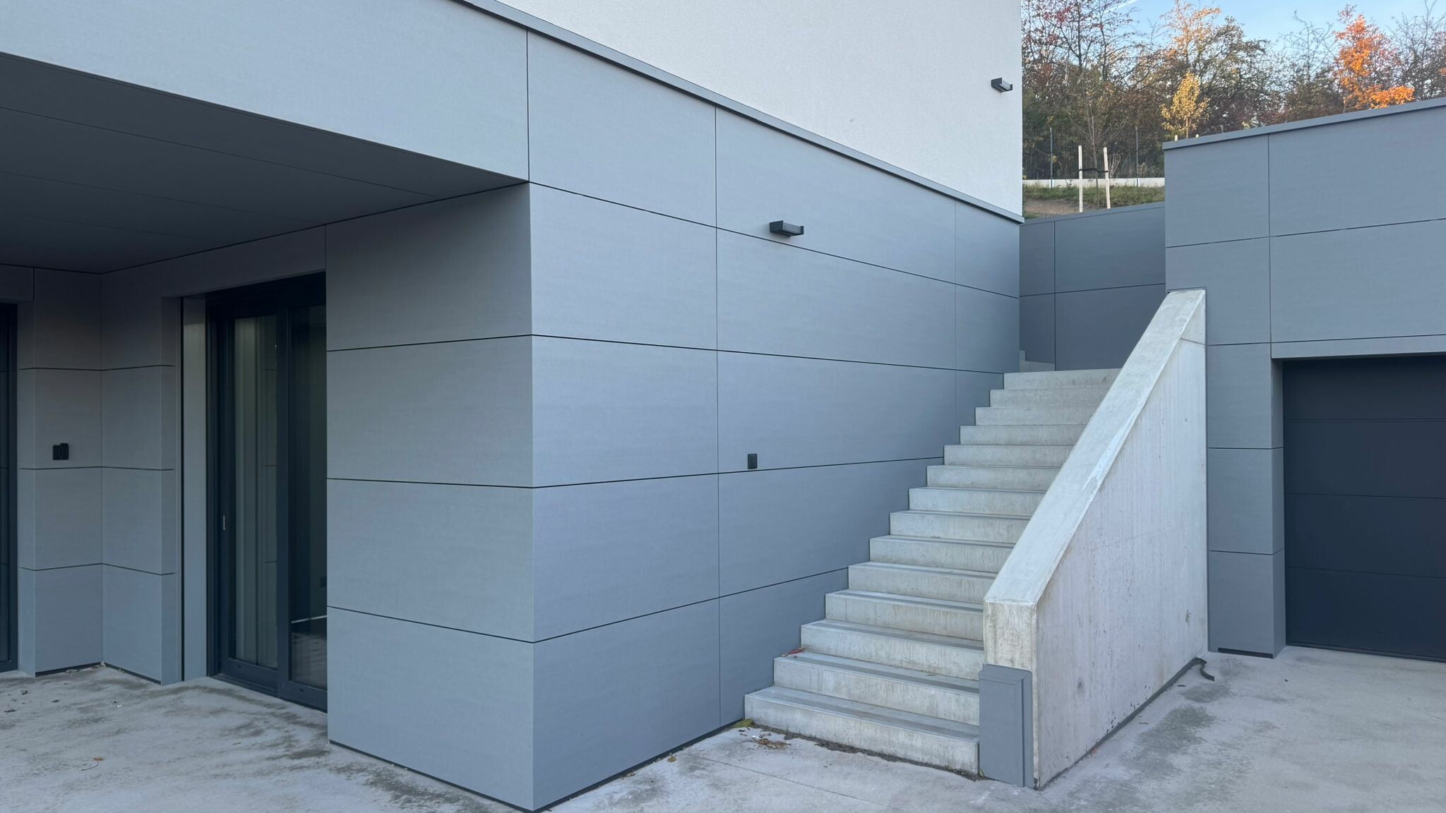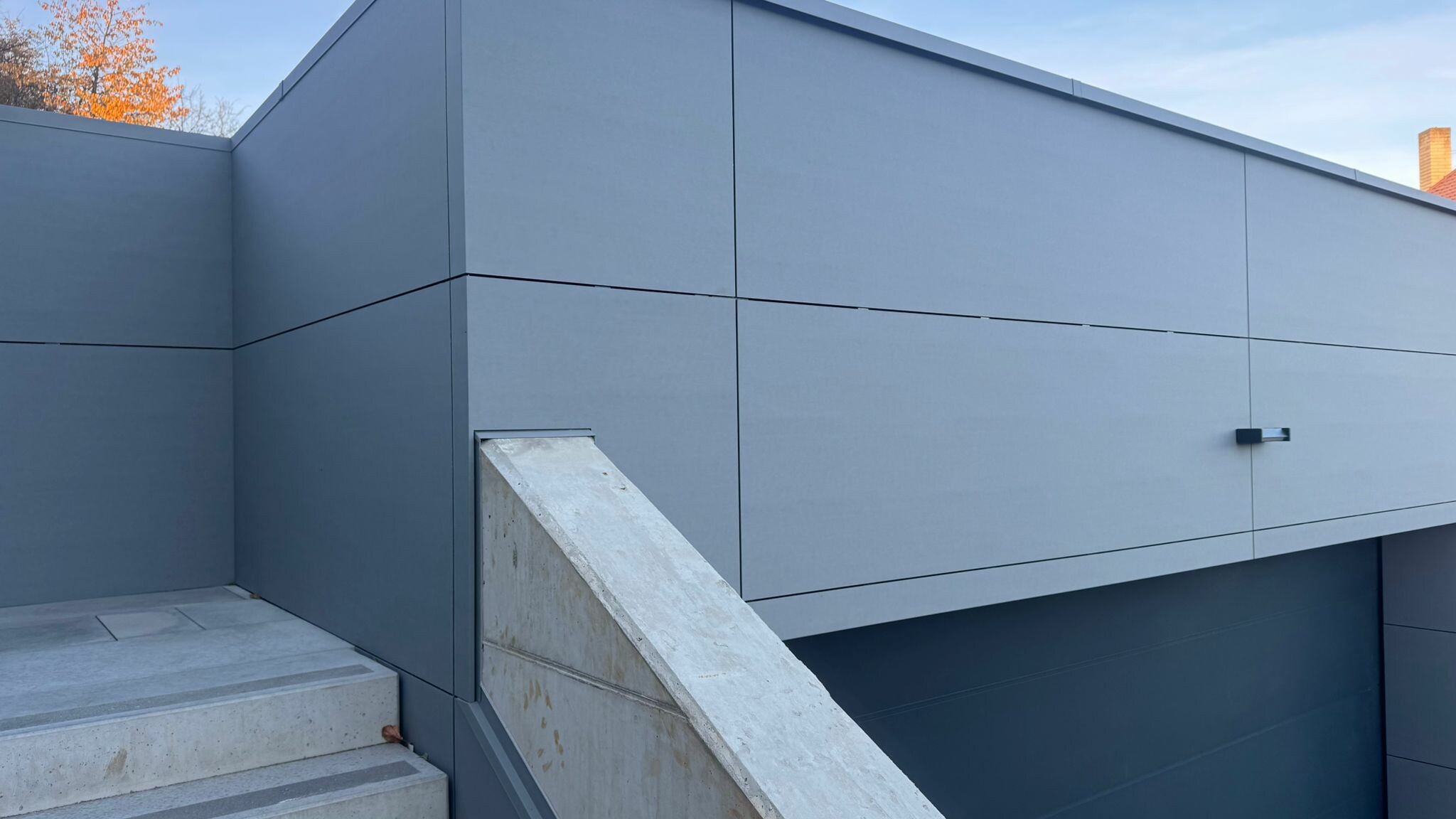 Tyto odolné desky v elegantní barvě patina šedá byly umístěny na podkladních kovových roštech Hilti a kotvily se lepením. Díky tomuto způsobu kotvení nejsou na deskách žádné viditelné připevňovací prvky. Fasádní systém PREFABOND (ostatně jako všechny fasádní systémy PREFA), byl realizován jako zavěšená zezadu provětrávaná fasáda.
