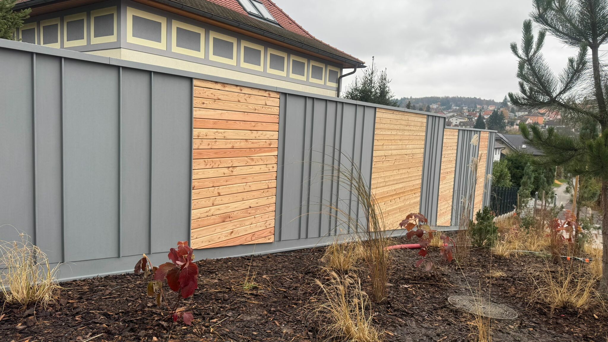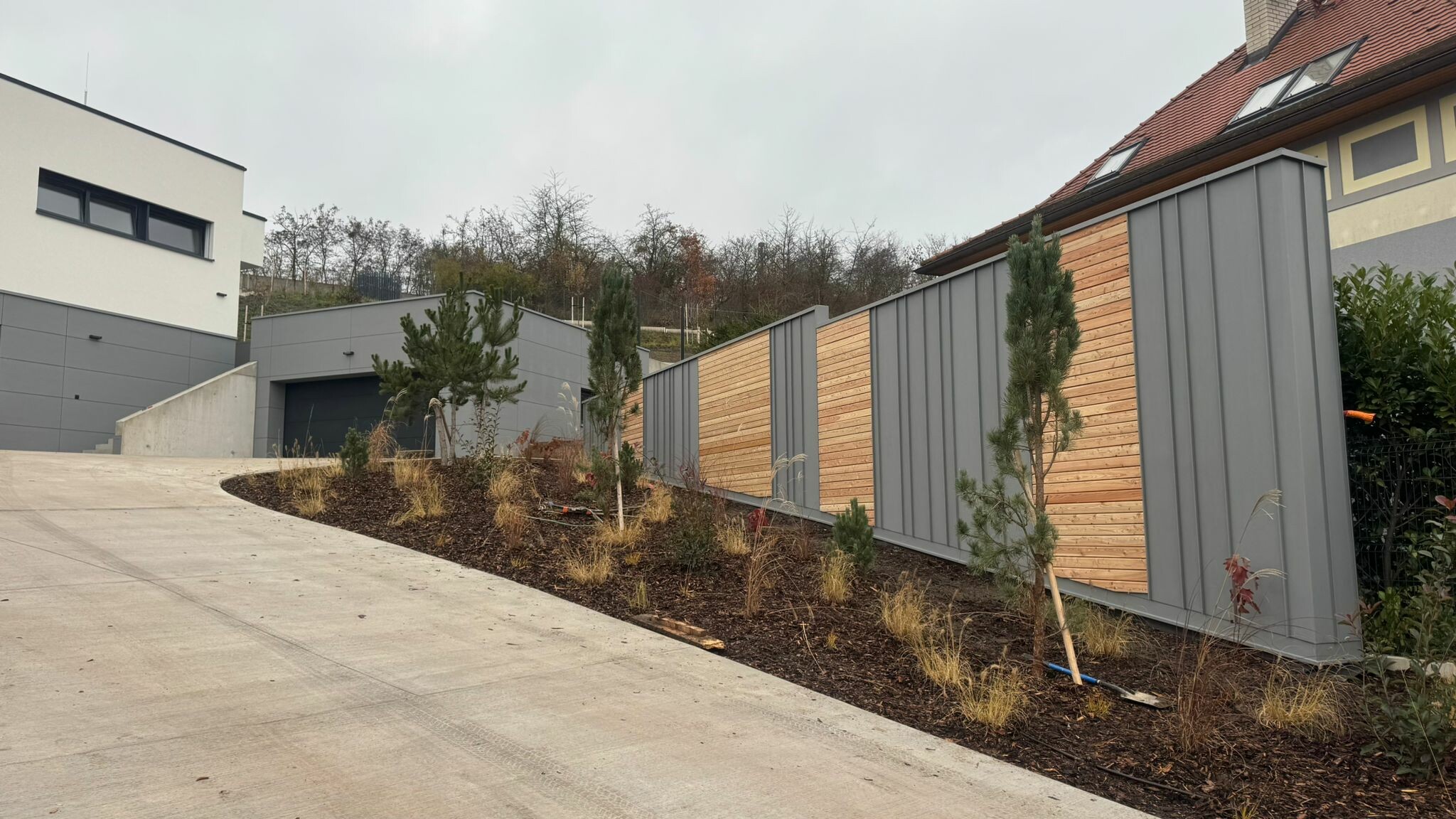 Vertikální hliníkové šáry z drážkové krytiny PREFALZ různých šířek jsou instalovány v kontrastu s horizontálními prkny ze sibiřského modřínu. Tato promyšlená kompozice efektivně opticky rozbíjí jednotvárnost povrchu a dodává oplocení moderní dynamiku, při zachování dlouhé životnosti obou prvků. Použití hliníkových drážkových pásů PREFALZ umožňuje variabilní šířky šárů a zajišťuje bezúdržbové a trvanlivé řešení.