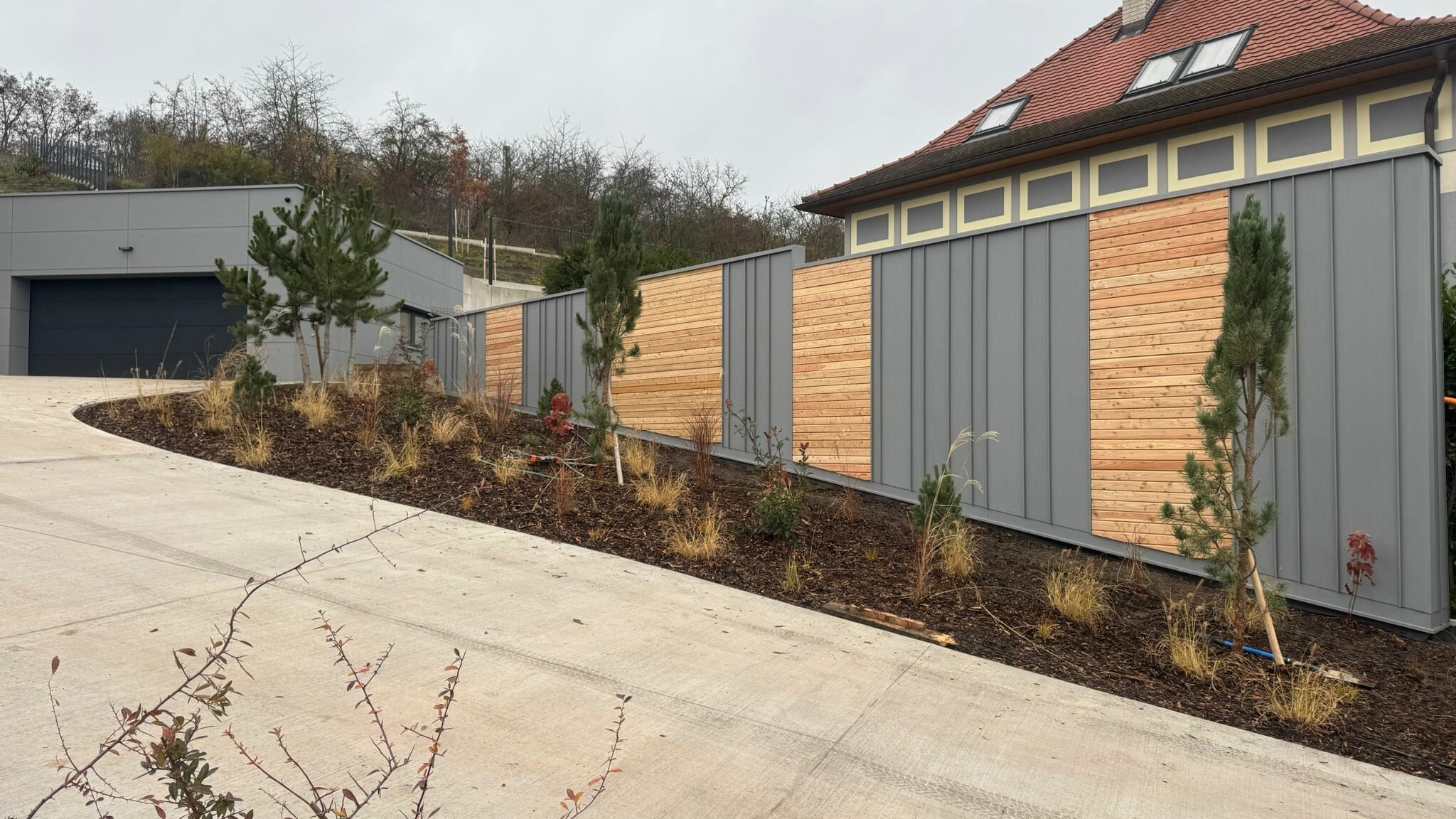 zatímco na plotové řešení použili kombinaci přírodního dřeva a drážkové krytiny PREFALZ.