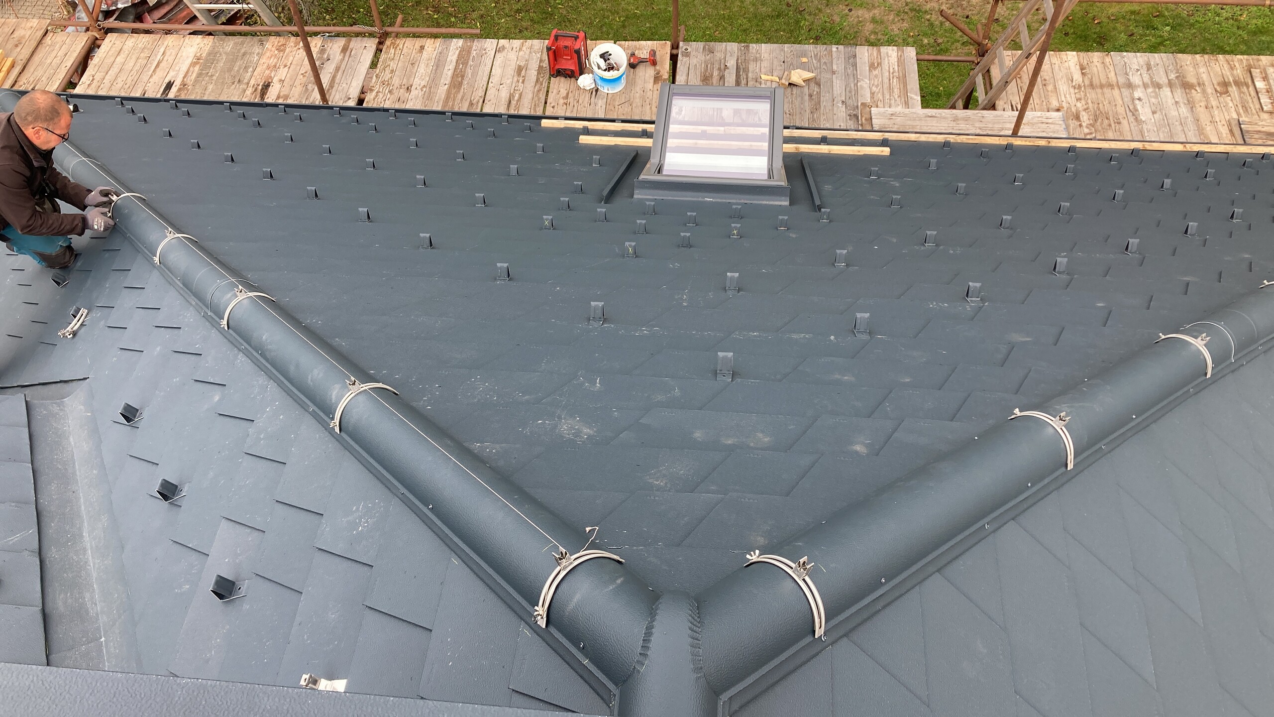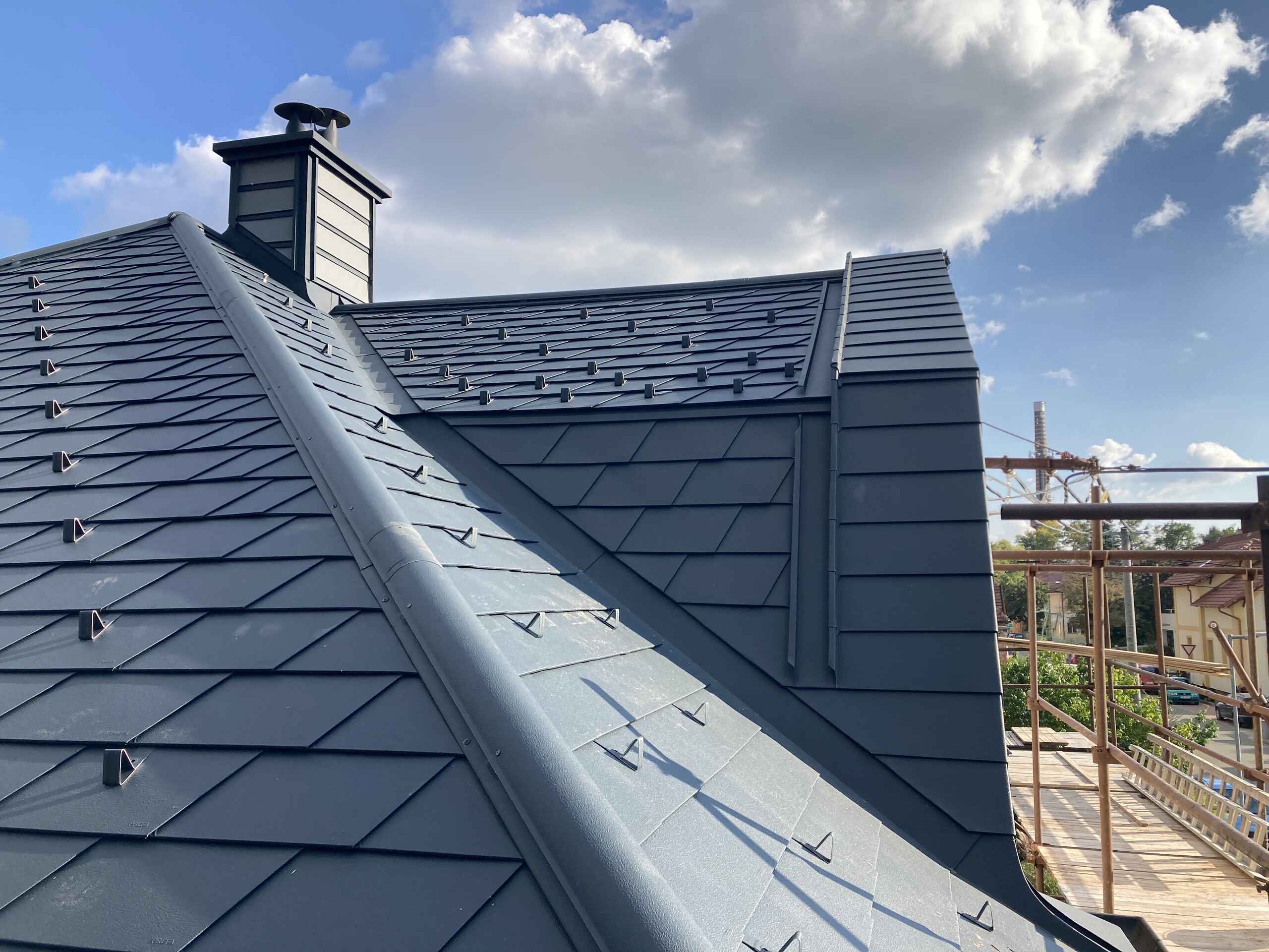 - nový střešní plášť z falcovaného šindele v barvě P.10 antracitové;