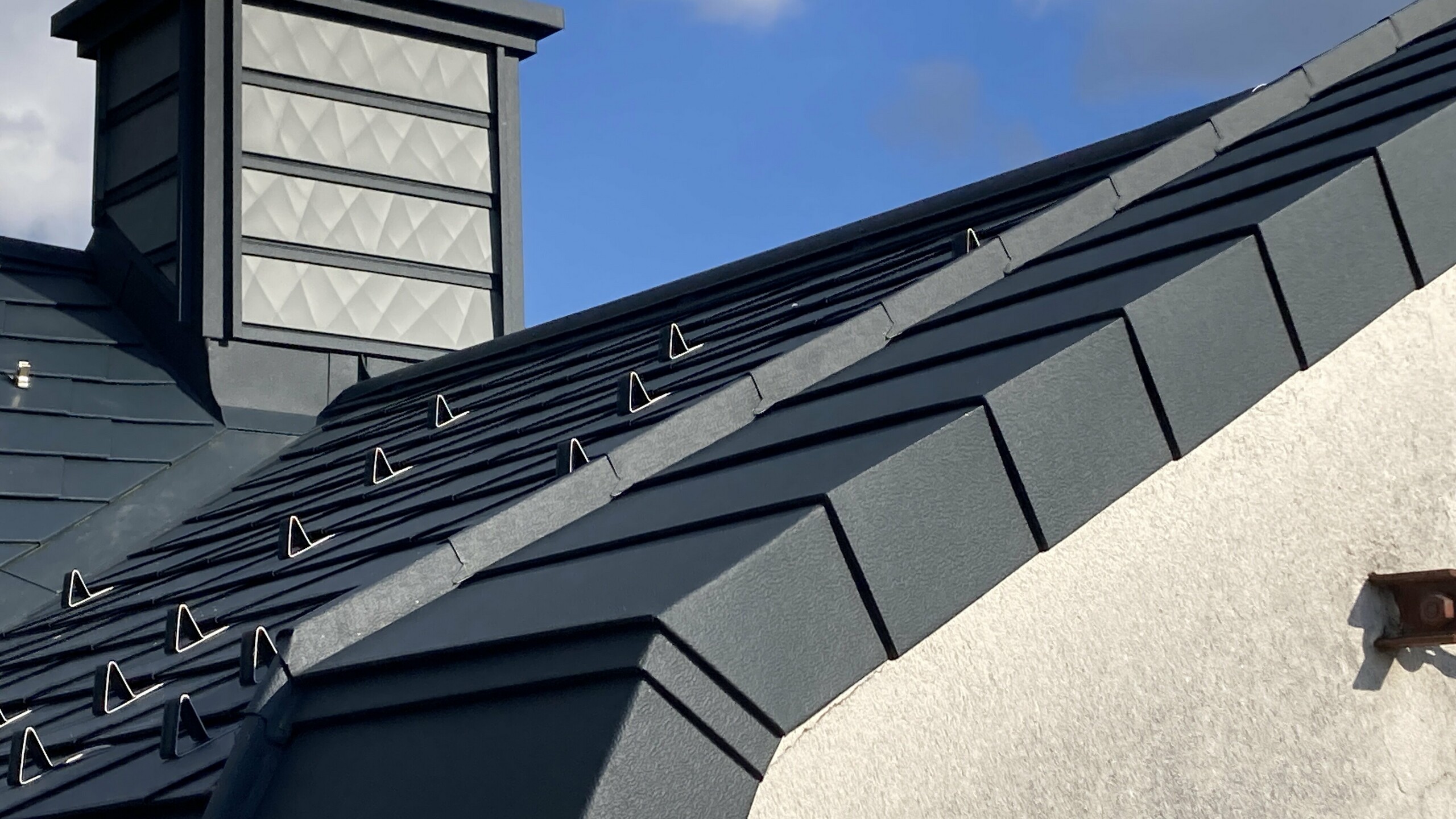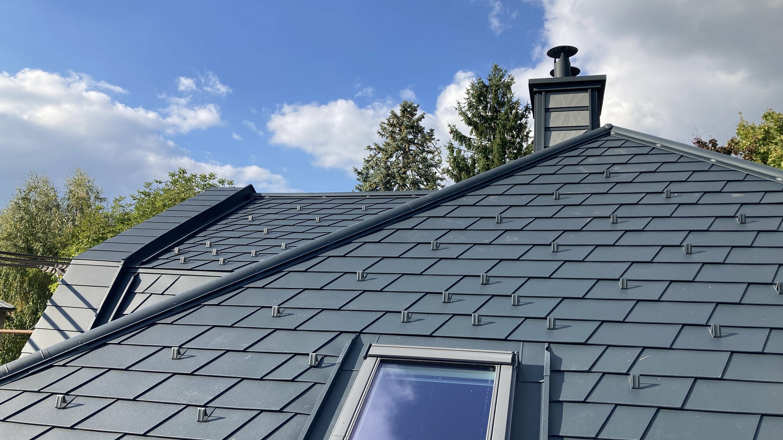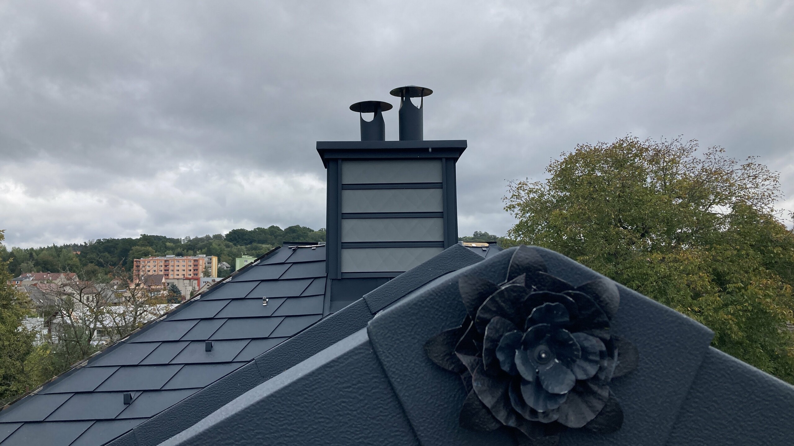 Dalším pozoruhodným detailem je také řemeslně vyrobená černá růže na čele střechy z plechu PREFALZ v barvě P.10 černé.